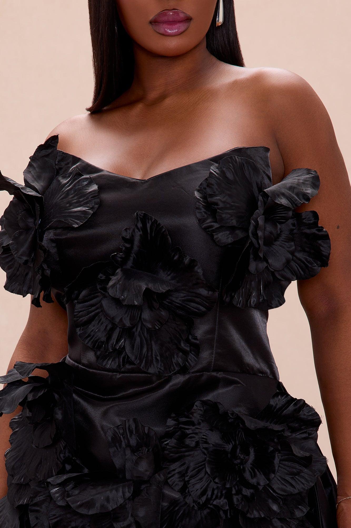 Available In Red, Black, And Chocolate. Taffeta Mini Dress Strapless Grip Tape Padded Bra Cups Boning Floral Applique Detail Back Drape, Lace Up Back Back Zipper Closure Lined Non Stretch Length= 25'', Sash Length= 59'' Shell & Trim: 100% Polyester Lining: 100% Polyester Imported