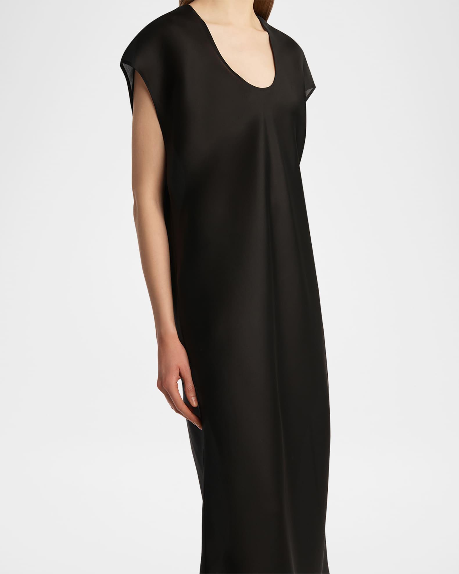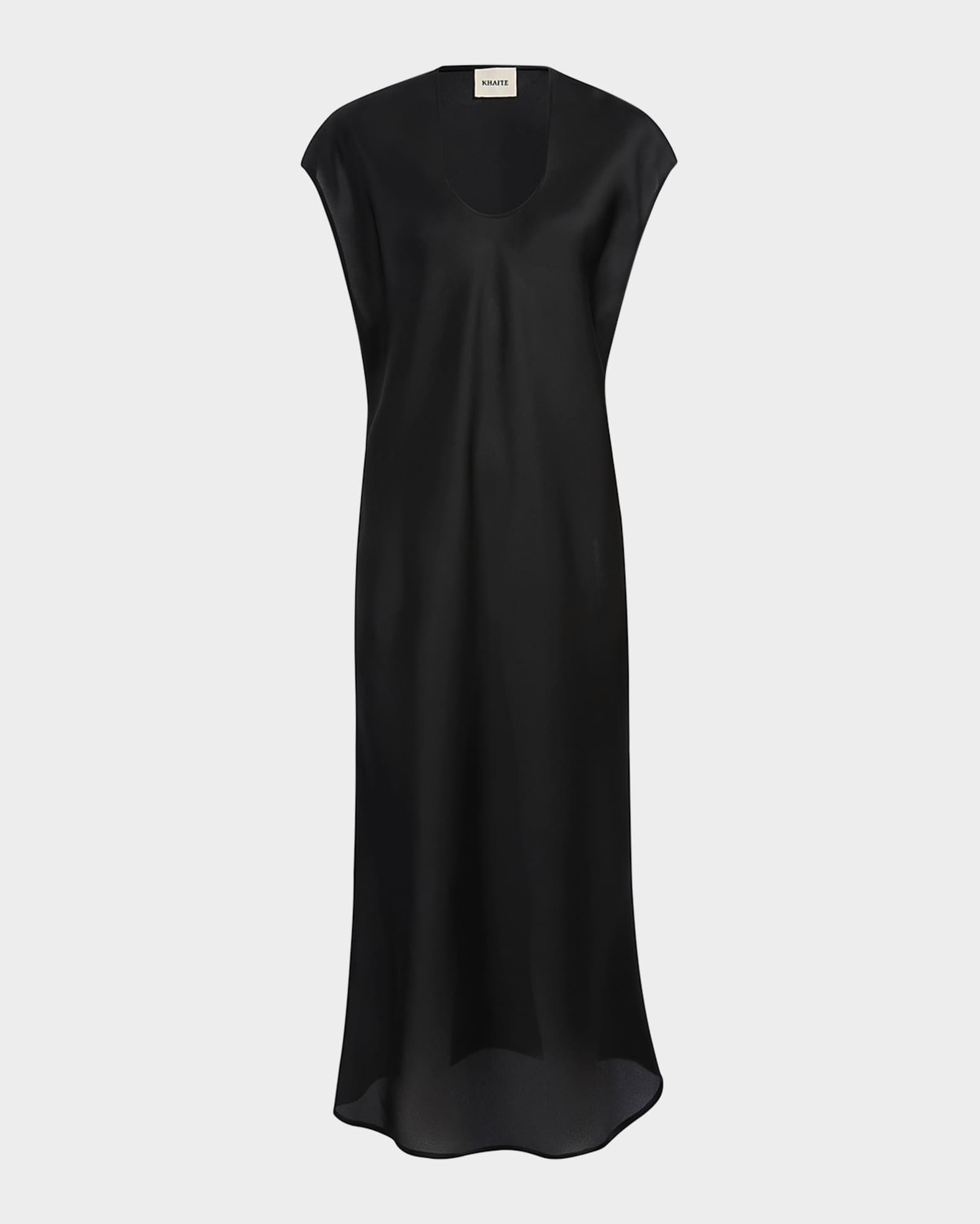 Khaite "Darby" dress cut on the bias Scoop neckline Cap sleeves Sheath silhouette Full length Slipover style Silk Made in USA