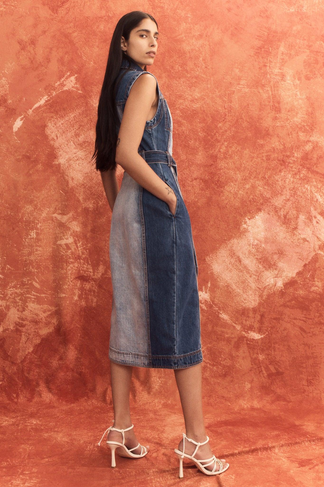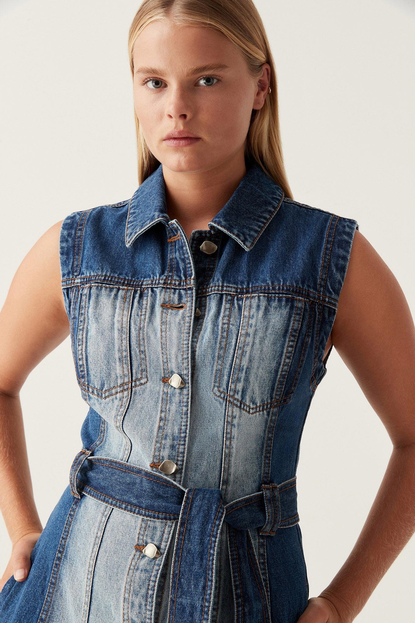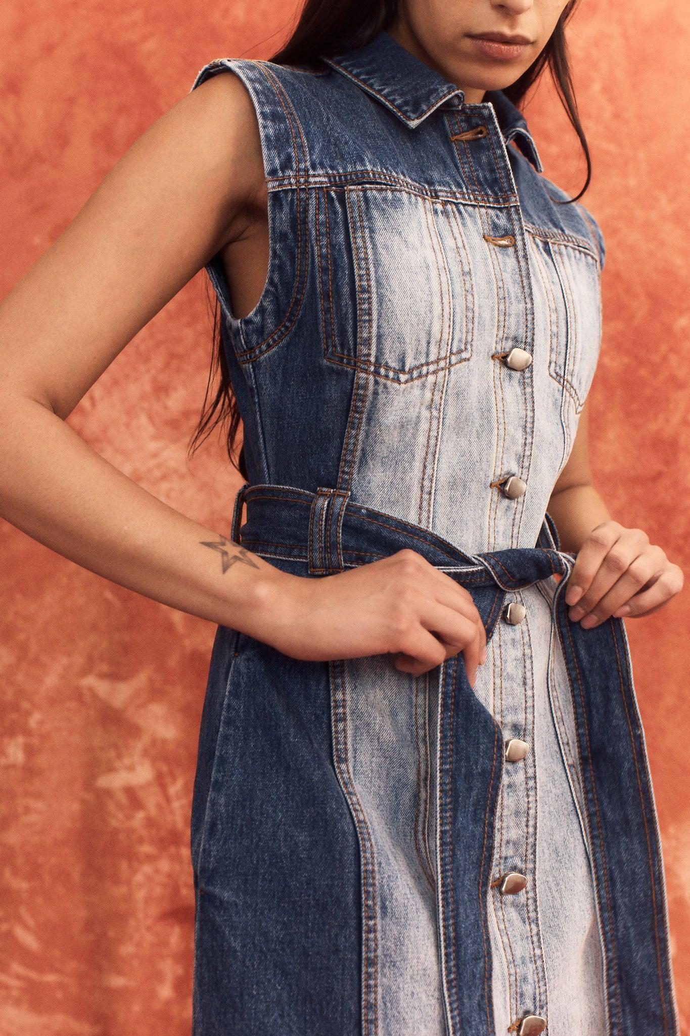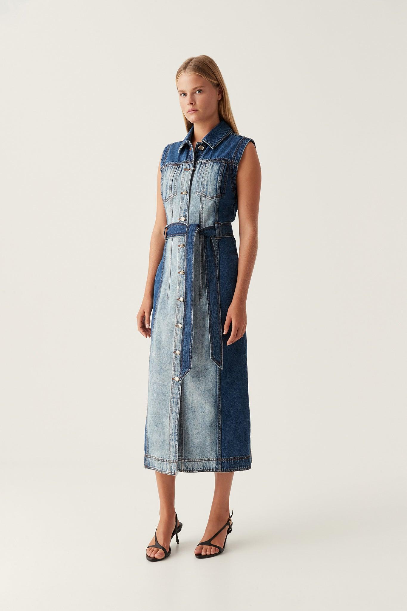 PRODUCT DETAILS Slim fit midi shirt dress Classic collar Sleeveless Panels with topstitching throughout Side seam pockets Centre front button closure Self tie belt Shop All Dresses SIZE AND FIT Model wears a size 8/S Model: 171cm/5'7 Bust: 82cm Waist: 64cm Hips: 84cm FABRICATION 100% Cotton Delicate cold machine wash with similar colours