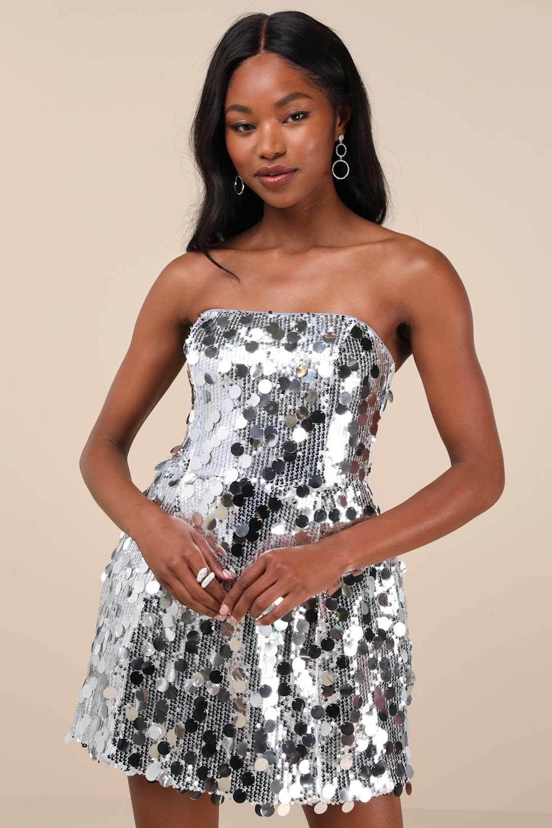 Radiate with endless confidence this holiday season with the help of the extro&vert Darcle Silver Sequin Mini Dress! This sensational dress features a stretchy mesh overlay, adorned with an array of silver sequins and eye-catching paillettes, that shapes a strapless, princess-seamed bodice with a straight neckline, hidden no-slip strips, and supportive boning. The high, fitted waist tops a figure-skimming, A-line skirt that falls to a flirty mini hem. A hidden tulle layer underneath lends a voluminous finish to this stunning design. Exposed silver zipper/clasp.