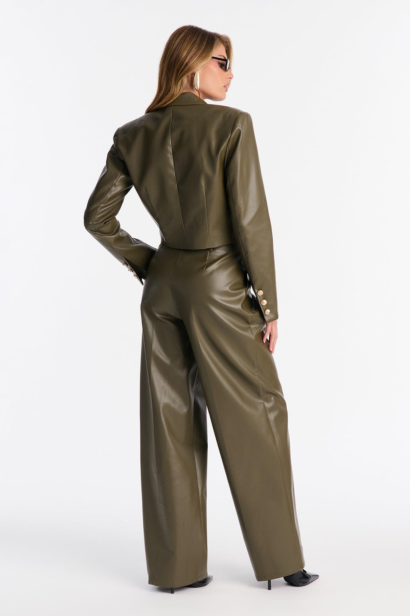 Available In Olive. 2 Piece Ensemble Button Front Blazer And Wide Leg Pant Set Non Stretcch Inseam 33" Lined Blazer Shoulder Pads Front Closure With Fly Zipper On Pant Pockets Top/Bottom Self: 100% Polyester With Polyurethane Coating Lining: 100% Polyester Imported