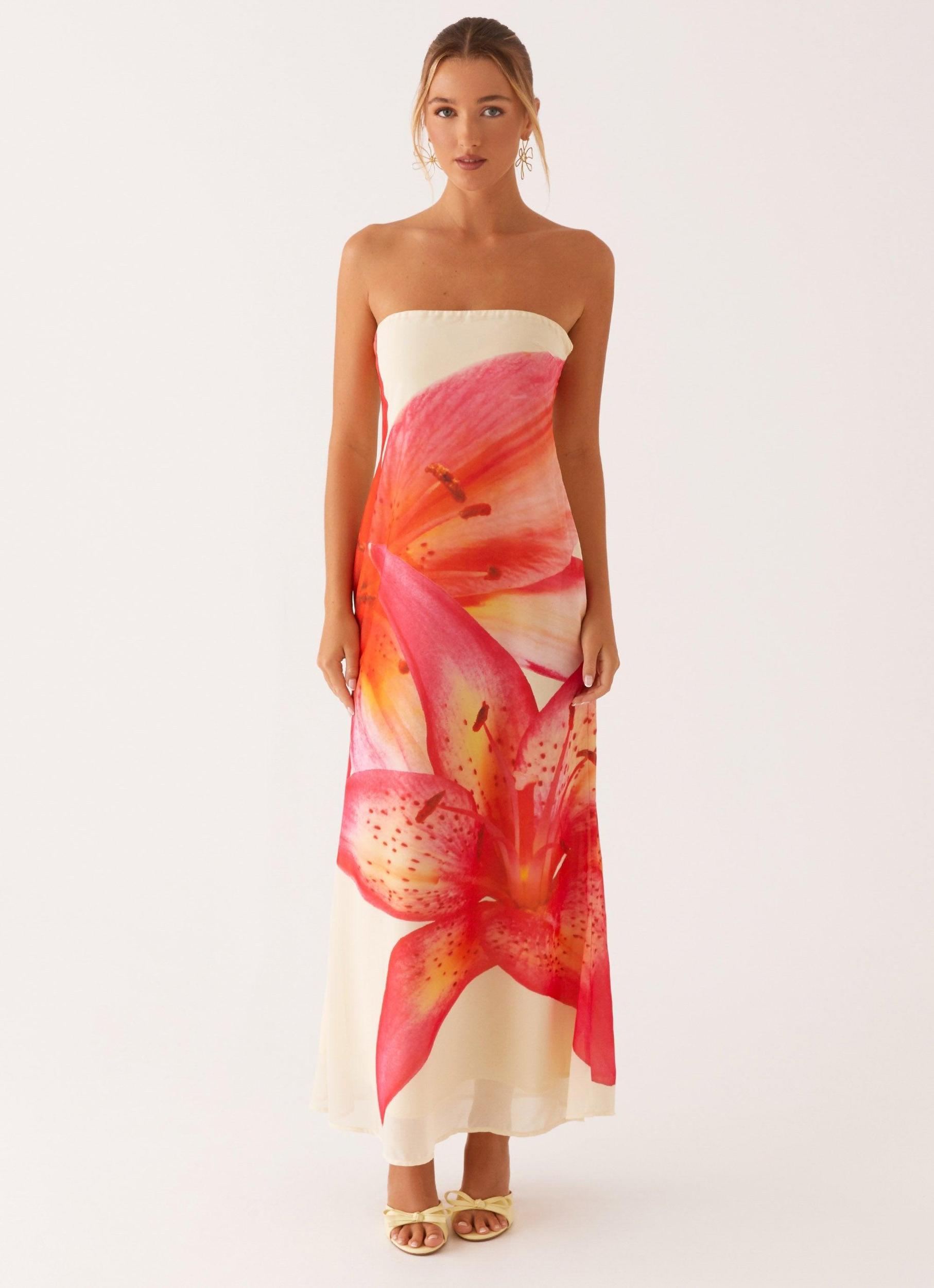 Peppermayo Exclusive The Darcy maxi dress is a show-stopping piece that combines elegance with a touch of uniqueness. Featuring a strapless neckline and an exclusive print, it stands out effortlessly. - Strapless neckline- Silicone taping- Maxi length- Exclusive print- Print placement will differ per garment- Side hook and eye, invisible zipper- Fully lined, "100% polyester"- Lining: "95% polyester, 5% spandex" Size AU 8 / US 4 garment measurements: Length: 119 cm / 46.9 inBust: 82 cm / 32.3 inWaist: 73 cm / 28.7 inHem: 162 cm / 63.8 in Yasmin is 174cm and wearing a size AU 8 / and US 4