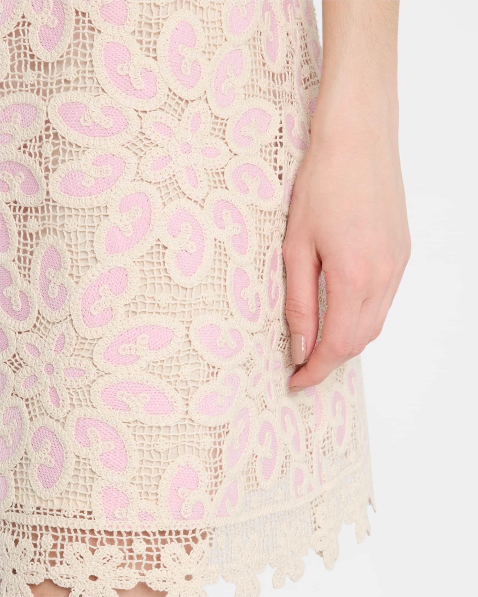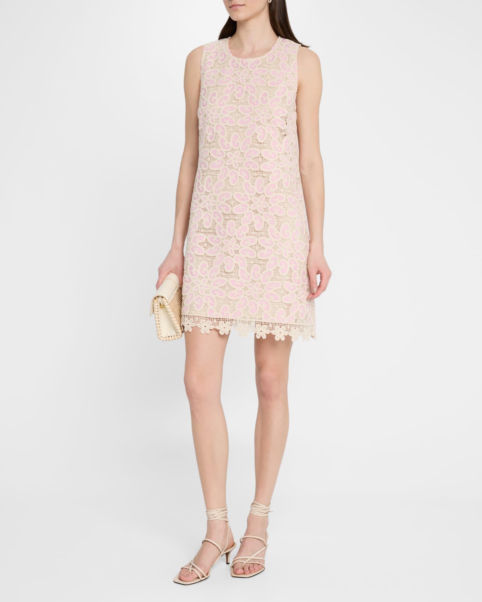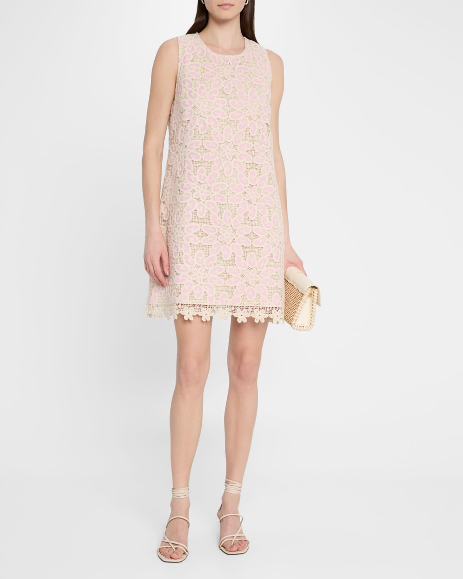 Johnny Was "Darcy" mini dress detailed with intricate floral and net crochet Jewel neckline Sleeveless Hem falls above the knee A-line silhouette Invisible back zipper Cotton/polyester Lining: Polyester Imported Please note: This merchandise may have a distressed effect. It is a unique feature that enhances the product and is not considered a defect.