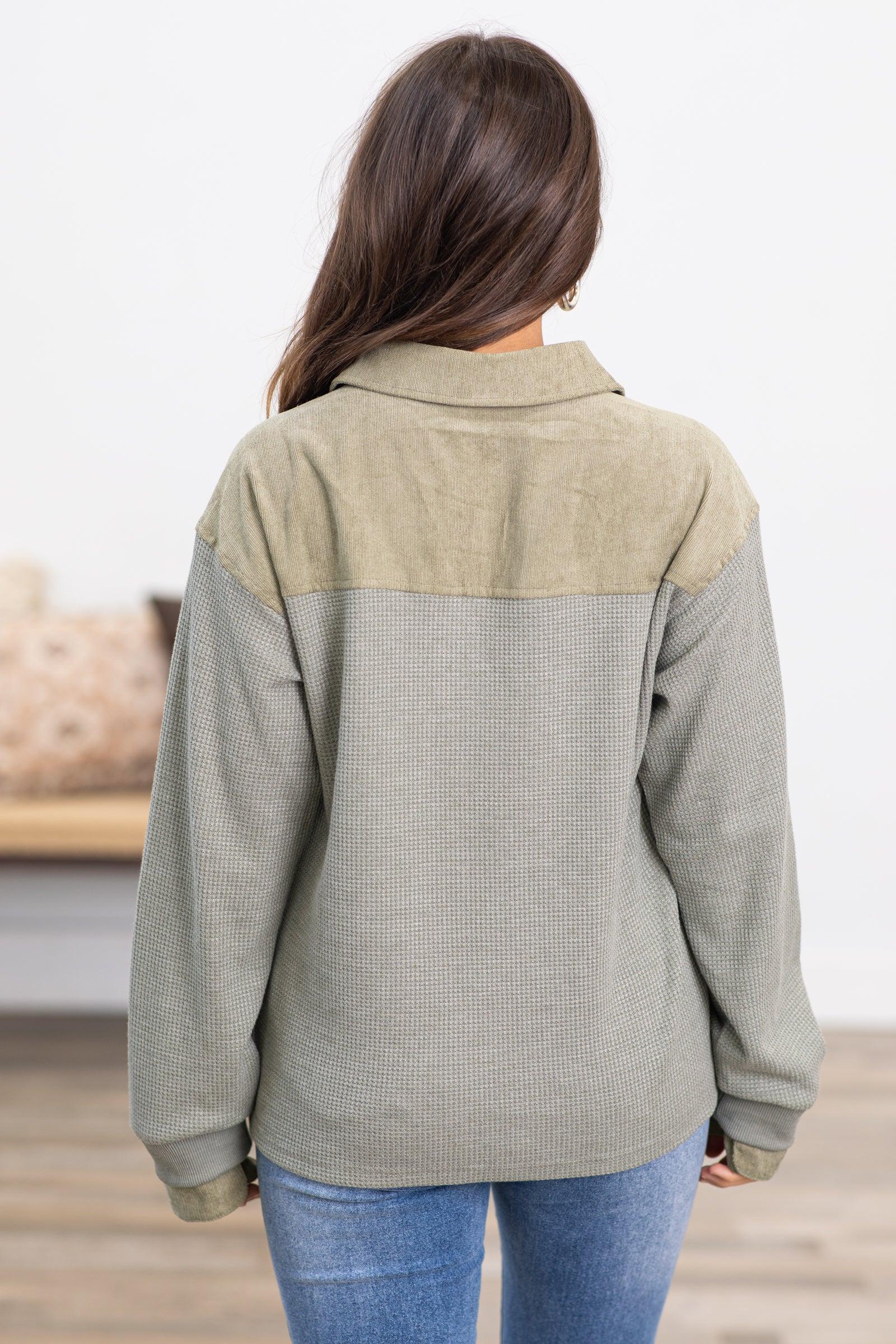 Product Details Colors: Dark Ash, Dark Sage Print: Waffle with Corduroy Collar: 1/4 Button Up Sleeve: Long Sleeve Hemline: Straight Material and Care Self: 96% Polyester 4% Spandex Contrast: 90% Polyester 8% Nylon 2% Spandex Hand Wash Cold Hang/Line Dry Size and Fit Small: Bust 38" Waist 36" Length 23.5"/24.5" Medium: Bust 40" Waist 38" Length 24"/25" Large: Bust 42" Waist 40" Length 24.5"/25.5" Photo model is 5'1 and wearing a size small
