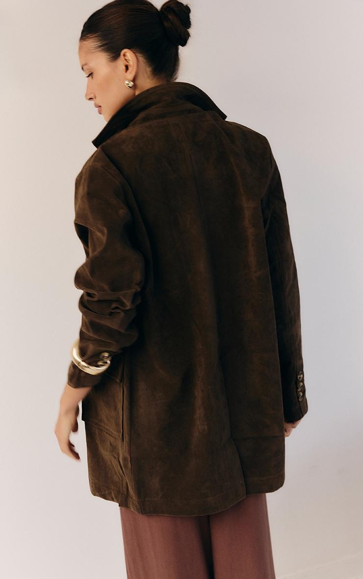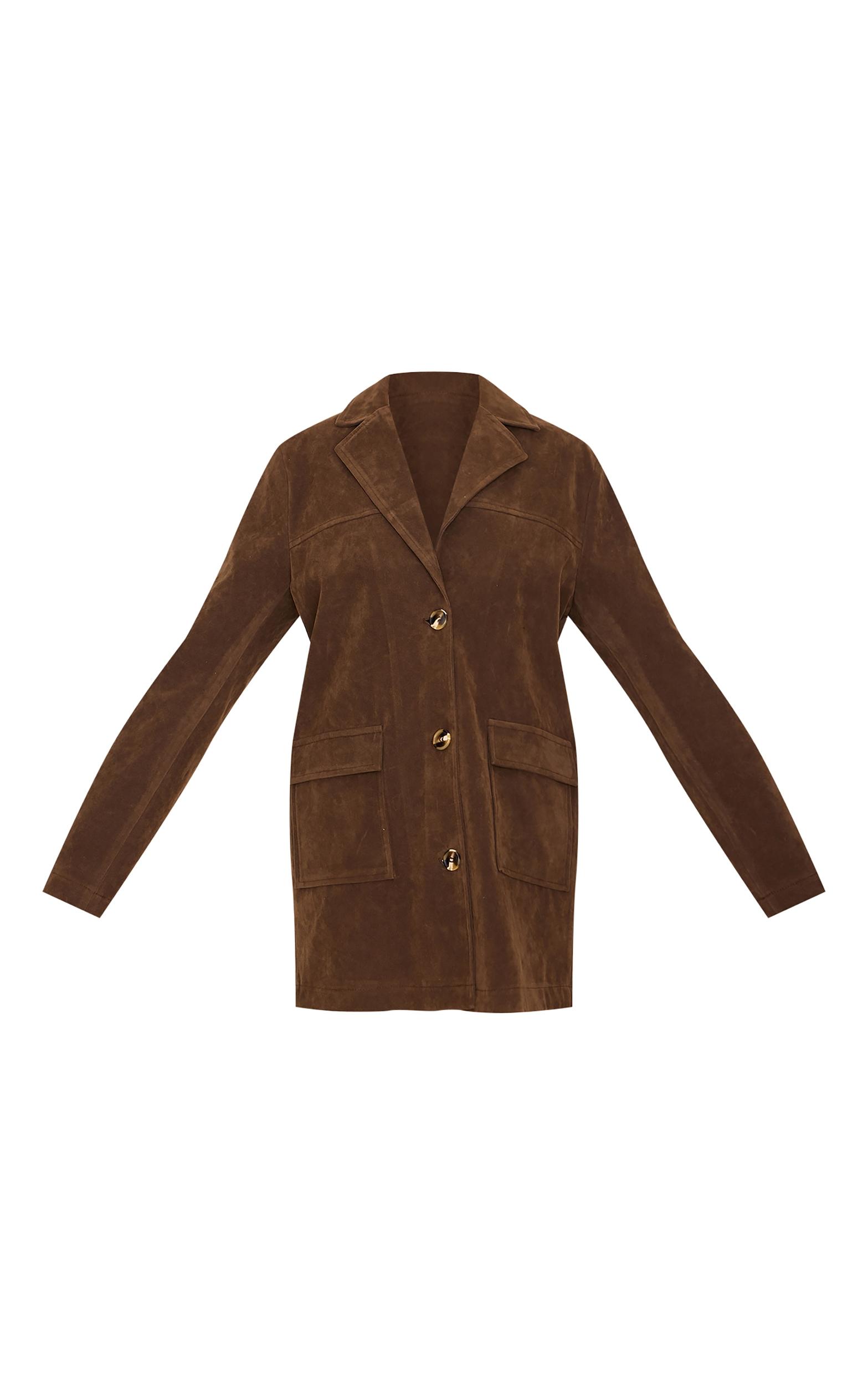 We're loving this dark brown oversized longline faux suede blazer coat for a must have in your collection. Brought to you in an edgy dark brown shade, with an edgy oversized fit and luxe faux suede material, what's not to love? Team with a white tee, a mini skirt, knee length boots and simple accessories to complete the look. Length approx 73.5cm/29inch (Based on sample size US 4)Model wears size UK 8/ EU 36/ AUS 8/ US 4Model Height - 5ft 9inchp]:!mb-4inch>Brand: PrettyLittleThingCategory: OuterwearProduct type: Oversized BlazerColor: Dark BrownMaterial: Faux SuedeOccasion: Day