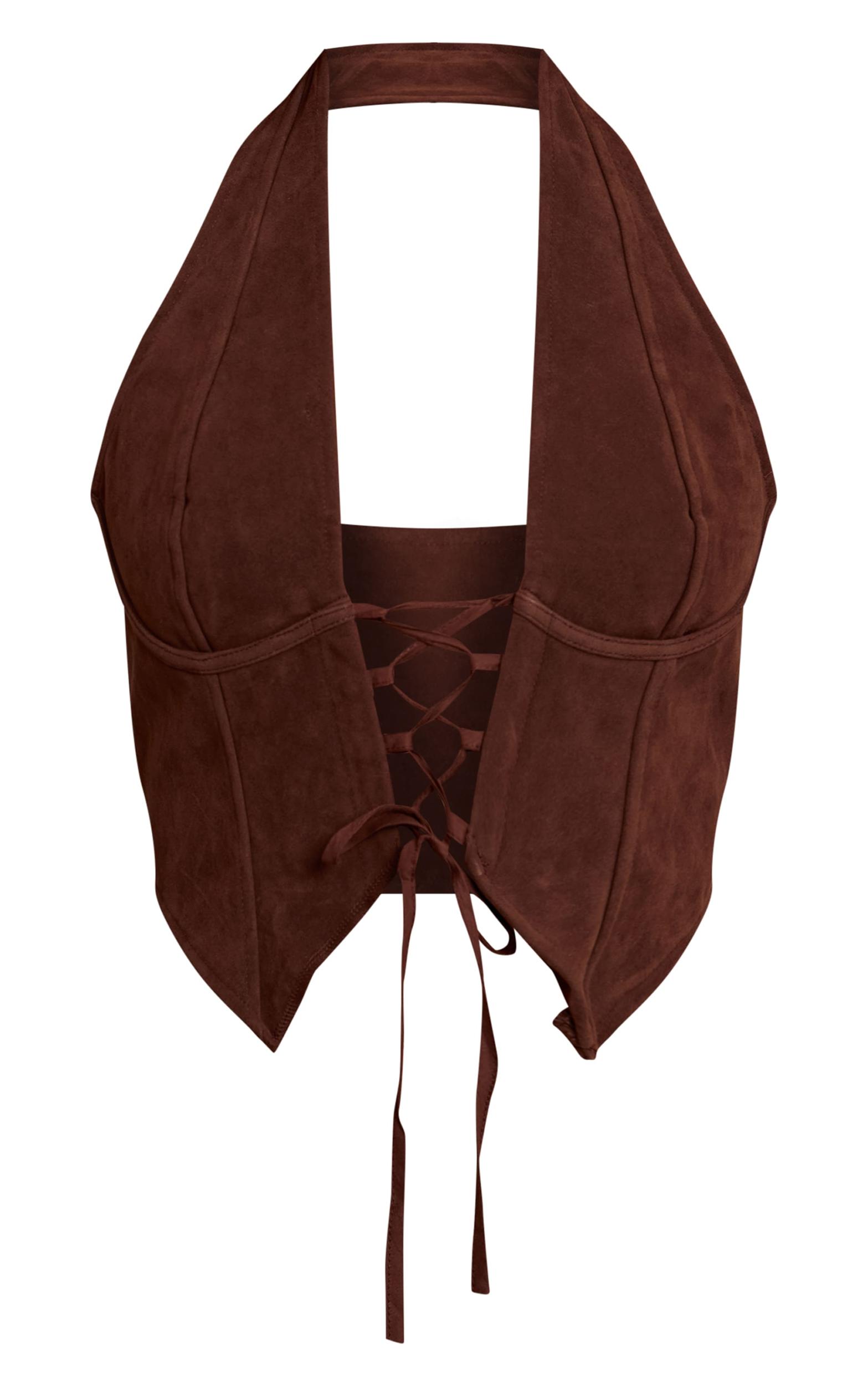 For moments that call for undeniable impact, look to the dark chocolate faux suede lace up plunge halterneck top. This piece commands attention with its artfully structured corset-style bodice, featuring a daring plunge neckline framed by the chic halterneck cut. A central lace-up detail cinches the look with confident appeal, while its cropped length and angled hemline offer a contemporary finish, perfect for making a statement. Pair yours with high-waisted tailored pants for an elevated evening aesthetic, completing the look with brown cowboy boots and statement gold earrings for an undeniably polished edge.Length approx 48.5cm/19inch (Based on sample size US 4)Model wears size UK 8/ EU 36/ AUS 8/ US 4Model Height - 5ft 9inchp]:!mb-4inch>Brand: PrettyLittleThingCategory: TopsProduct type: CorsetColor: Dark ChocolateMaterial: Faux SuedeOccasion: Evening