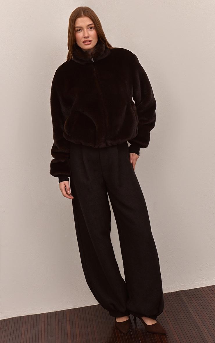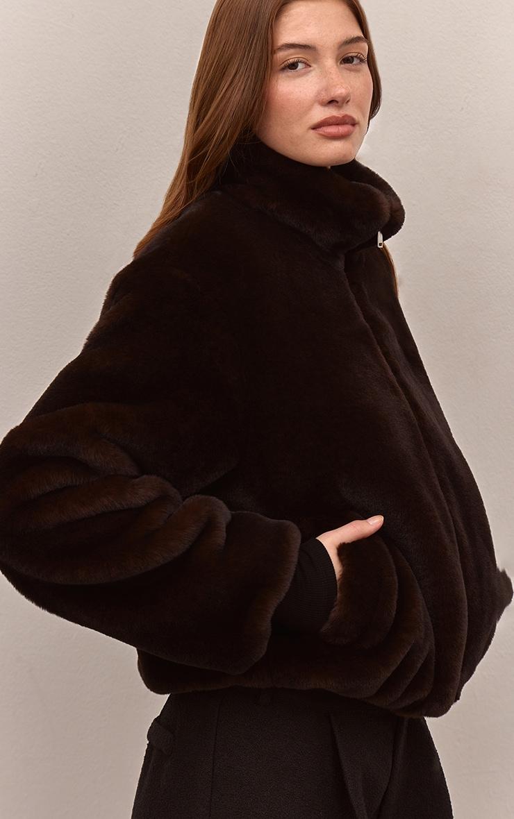 Elevate your outerwear with the dark chocolate plush faux fur cropped bomber style coat. Designed in plush faux fur fabric in a deep chocolate shade, this bomber coat features a cropped fit and soft lining for ultimate warmth. Layer over sleek separates for a touch of luxury.Length approx 48.5cm/19inch (Based on sample size S)Model wears size SModel Height - 5ft 9inchp]:!mb-4inch>Category: OuterwearProduct type: Faux FurColor: Dark ChocolateMaterial: Faux FurOccasion: Day