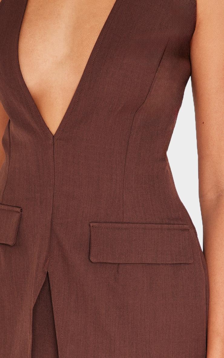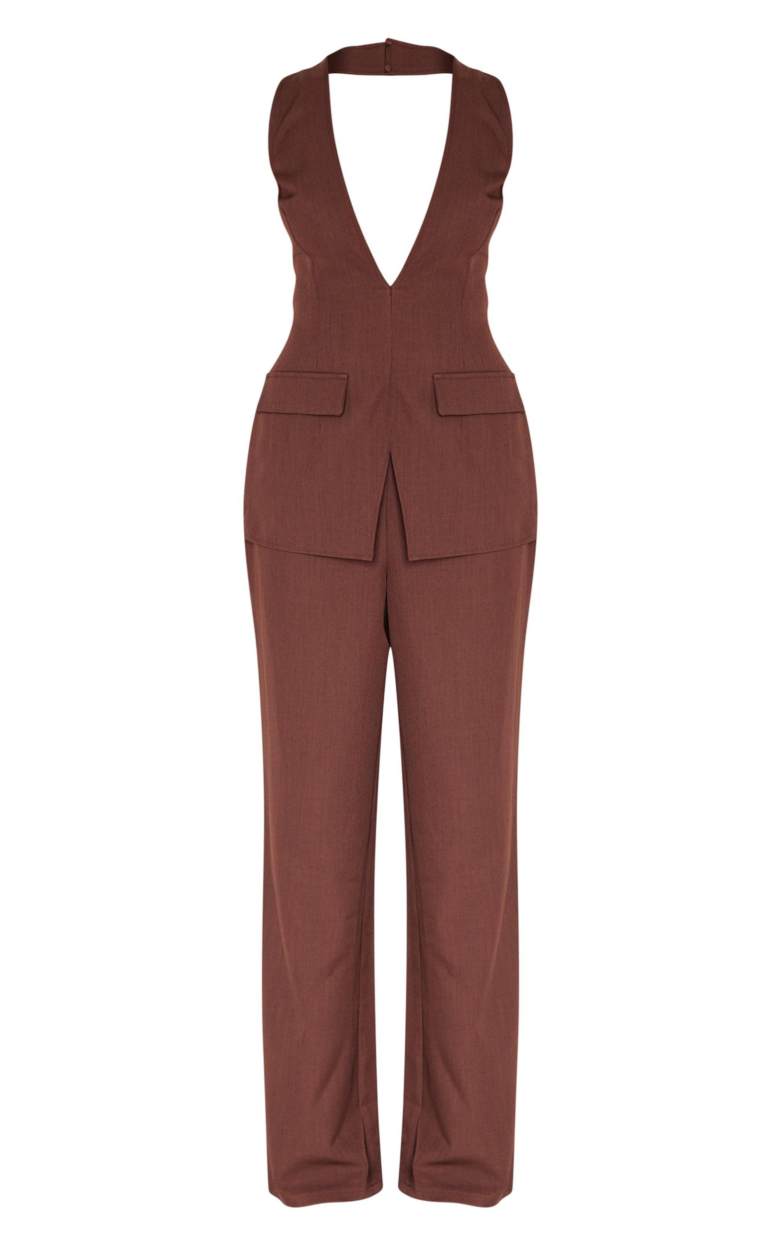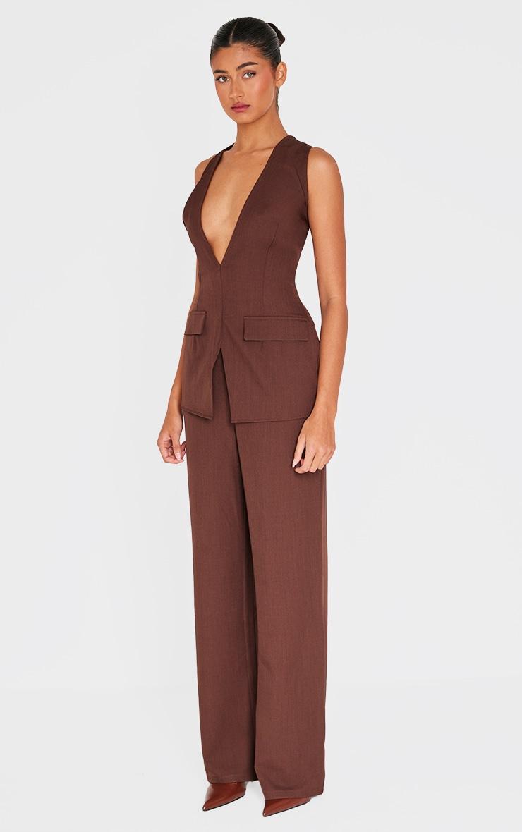 Take a chance on this dark chocolate structured woven vest detail straight leg jumpsuit for a look you won't regret. Brought to you in a rich dark chocolate hue, with a luxe structured woven material and flattering vest detail, what's not to love? Style with a pair of court heels and simple accessories for a look like no other. Length approx 160cm/63inch (Based on a sample size UK 8) Model wears size UK 8/ EU 36/ AUS 8/ US 4Model Height - 5ft 7inchp]:!mb-0inch>Category: Jumpsuits & PlaysuitsProduct type: Tailored JumpsuitColor: Dark ChocolateMaterial: Woven CrepeDesign: PlainNeckline: PlungeSleeves: SleevelessOccasion: Evening