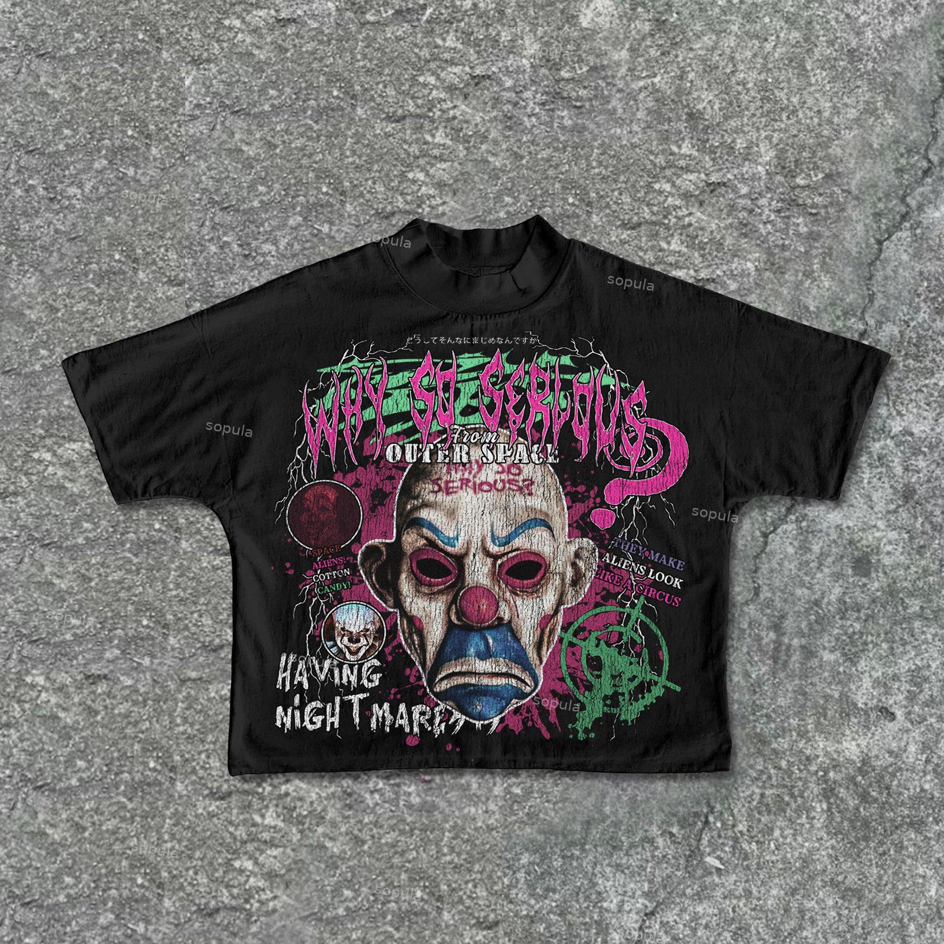 SPU: CP-165355-WCX Fabric Name: 100% Cotton Pattern: Dark Fear Joker Graphics Process: Printed Style: Vintage Length: Regular Collar: Round Neck Popular Elements: Broken Print Sleeve Type: Short Sleeve Occasion: Daily Theme: Summer