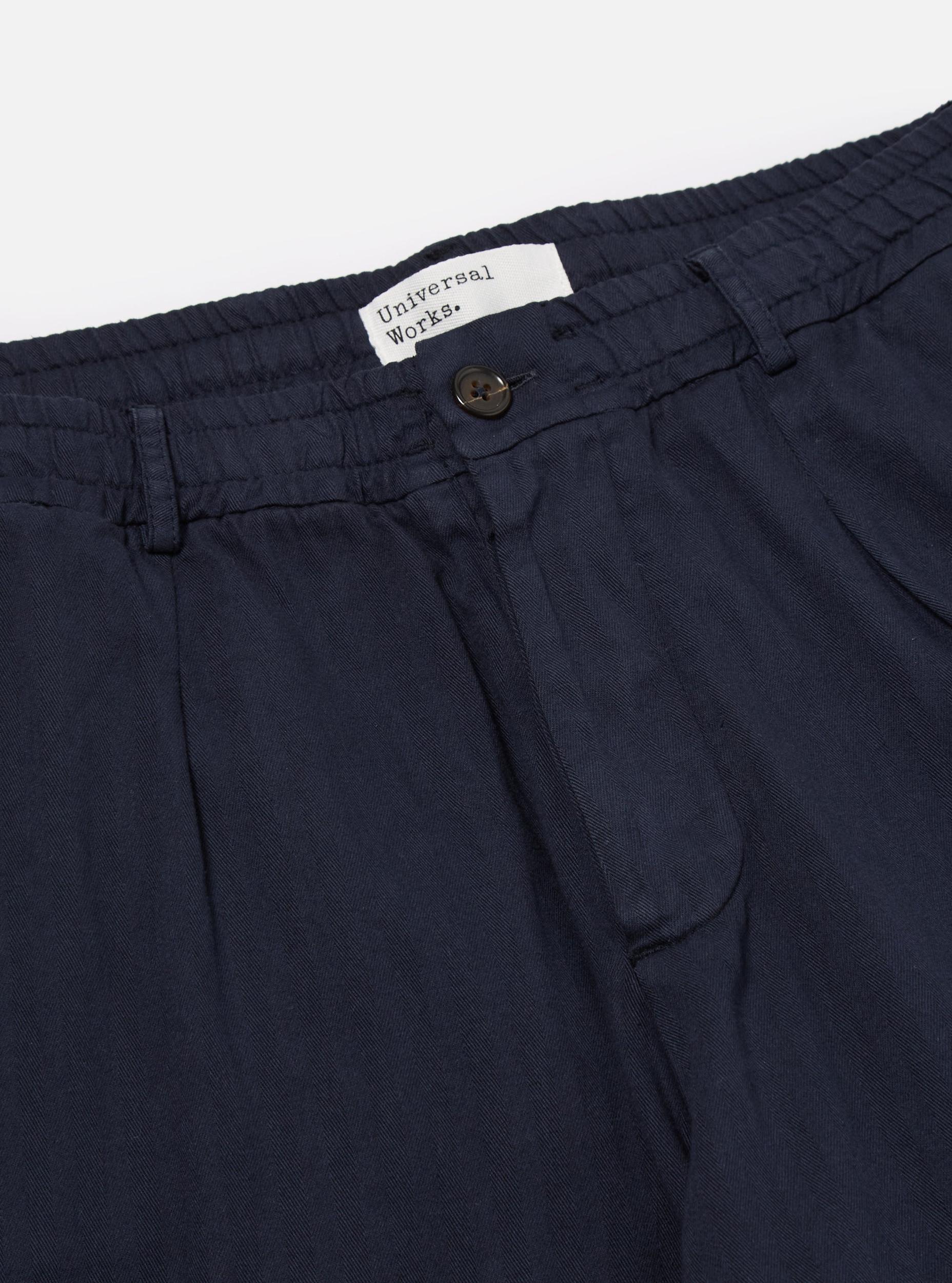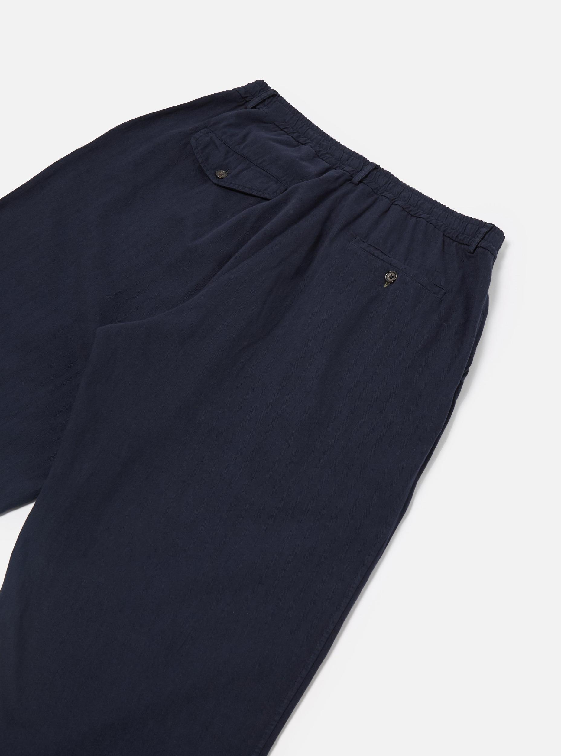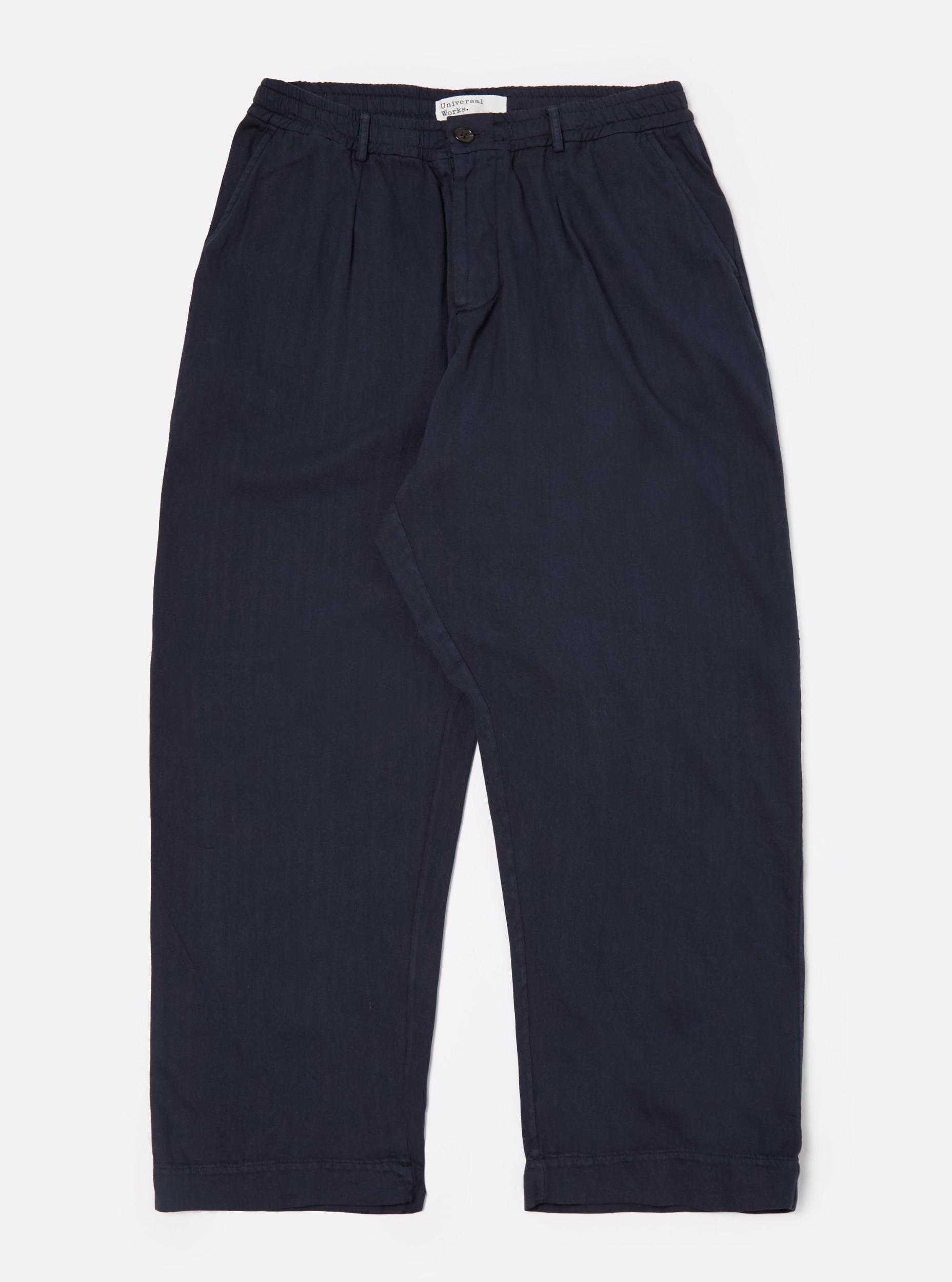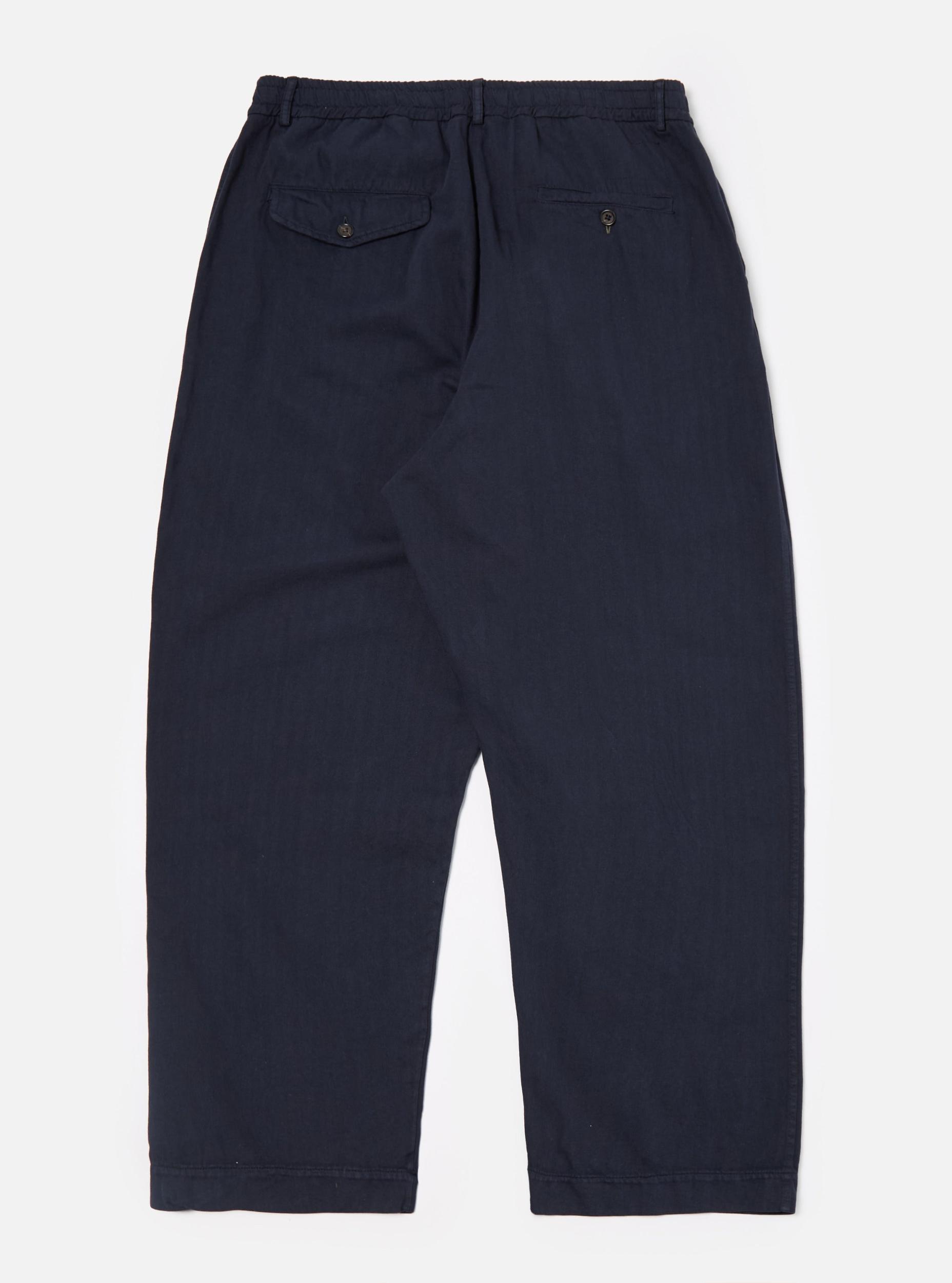 Single pleat front, wide leg trousers with a slight taper. A fuller and larger shape when compared to our Pleated Track Pant. Our model is 6' 0'' with a 30.5’ Waist and is wearing a size ‘32.’ A summer-weight cotton, with a herringbone weave pattern. Made for us in Italy and garment-dyed for a beautiful finish. • Wide loose leg. • Elasticated and drawstring waist. • Button fly. • Single pleat front. • Two rear pockets: buttoned flap & button jetted. • Two front pockets with internal ticket pocket. • Fabric Composition: 100% Cotton. Trim: 100% Cotton. • Washcare: Wash at 30 degrees. Do not bleach. Do not tumble dry. Warm iron. Do not dry clean. Wash like colours together. Do not iron decoration. • Please be aware that the measurements above are technical measurements that are based on the garment laid flat and are useful as a general guide only. Measured in Centimetres. 26 28 30 32 34 36 38 Outside Leg Including Waistband. 98 98 98 101 105 108 108 Waist. 33.3 34.5 37 39.5 42 44.5 47 Thigh - 2.5cm Below Crotch. 37.5 38.5 40 41.5 43 44.5 46 Hem Opening Width. 22 22 22 23 24 25 26 Front Rise Including Waistband. 29 30 31 32 33 34 35 Back Rise Including Waistband. 44 45 46 47 48 49 50