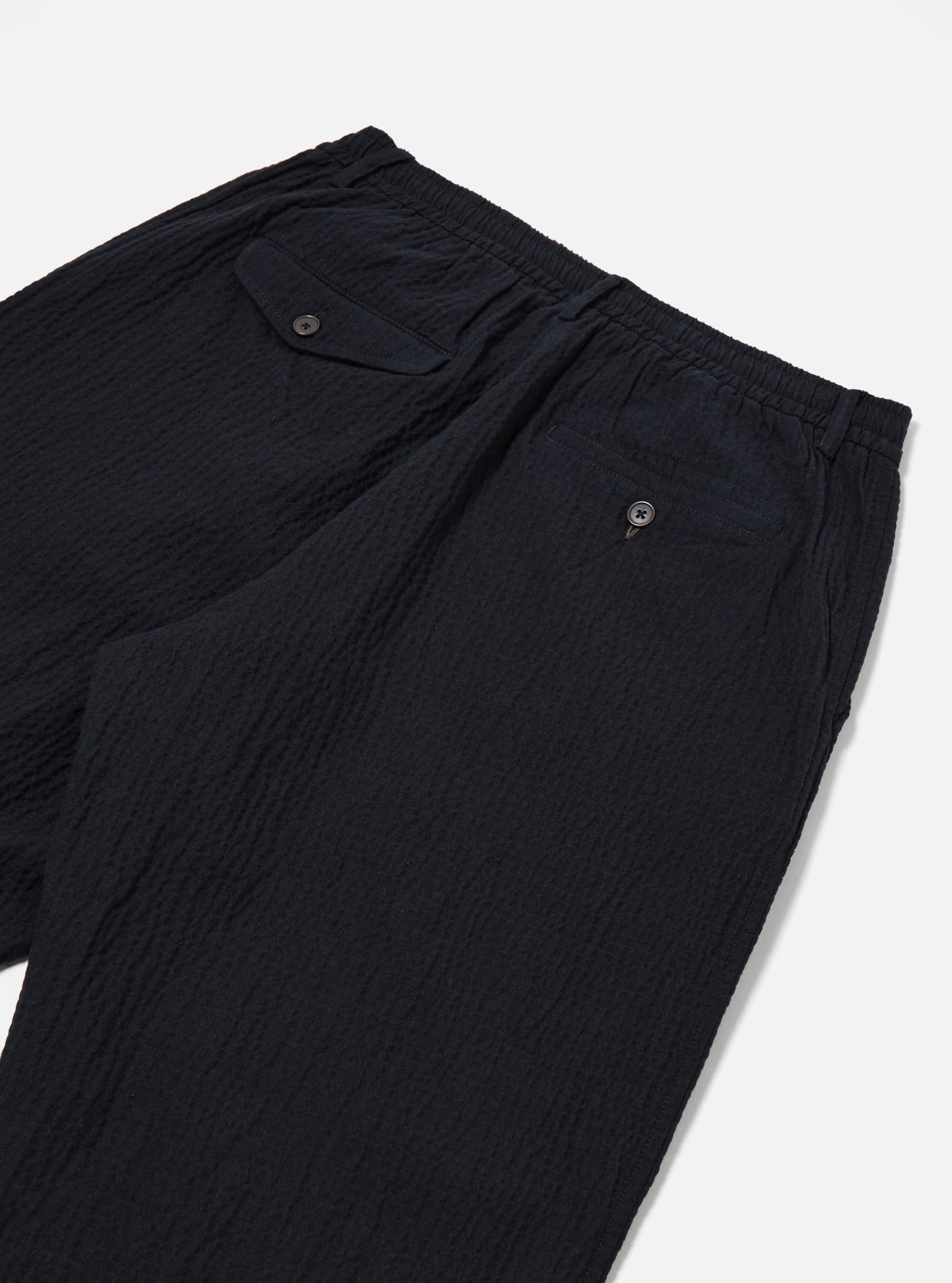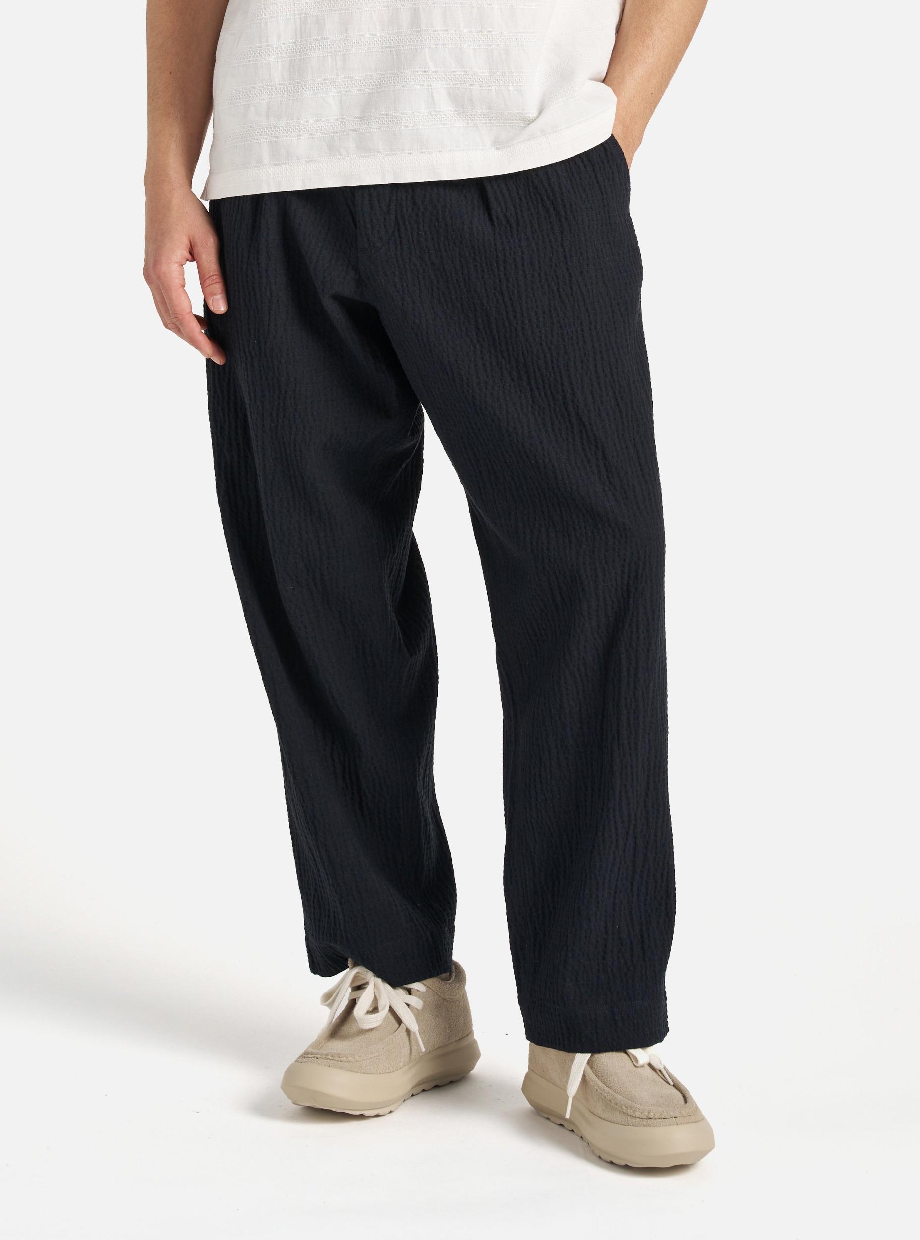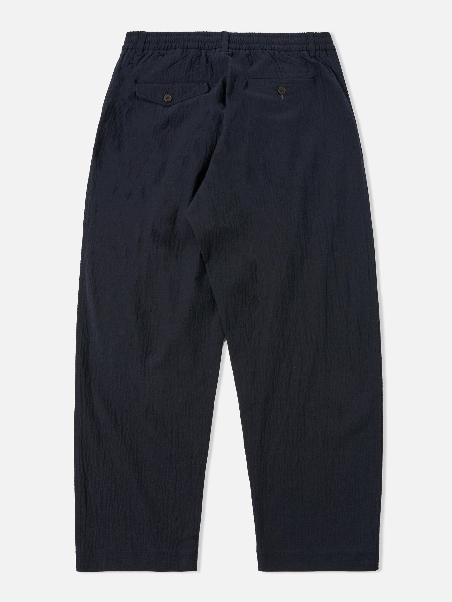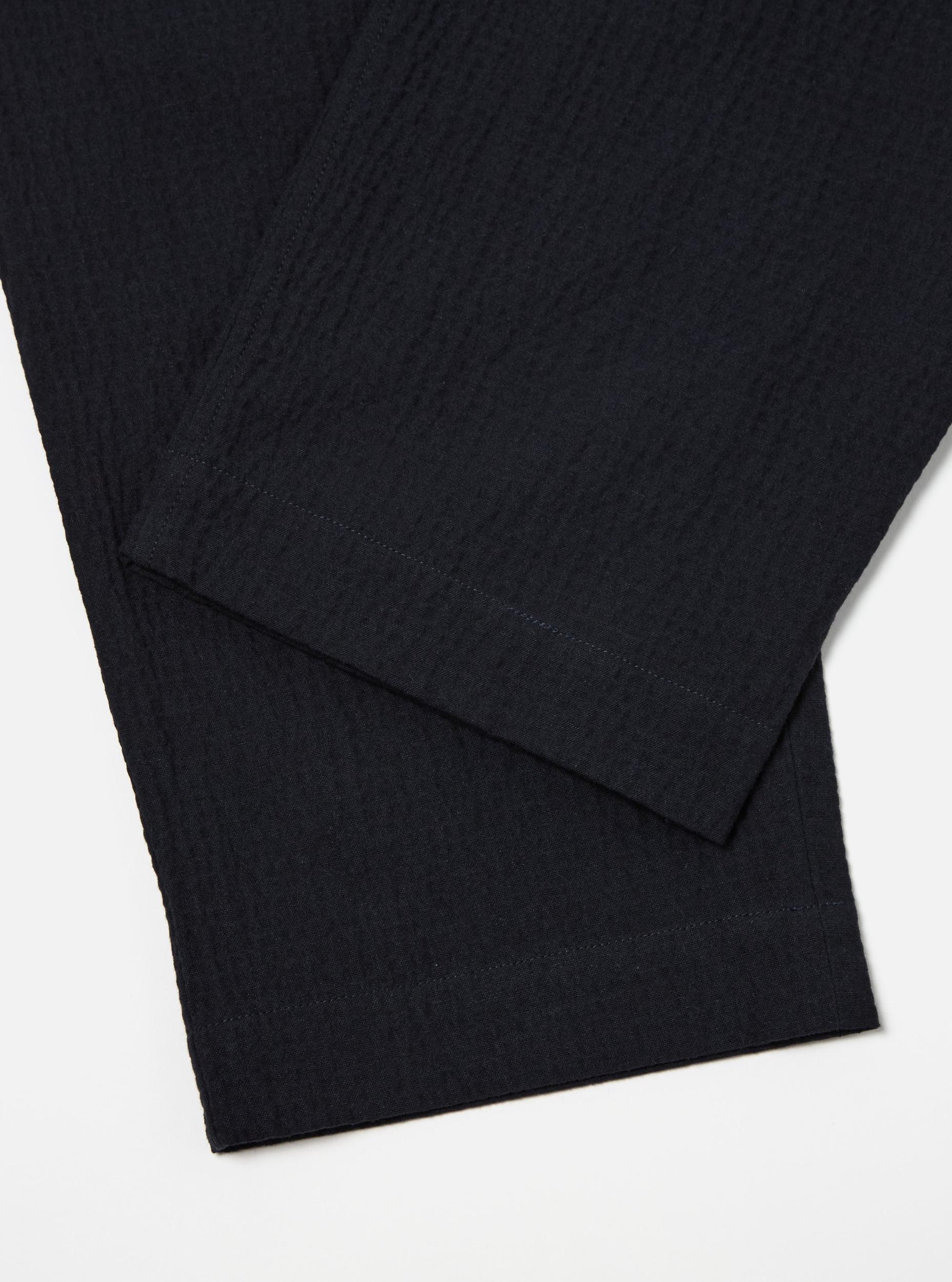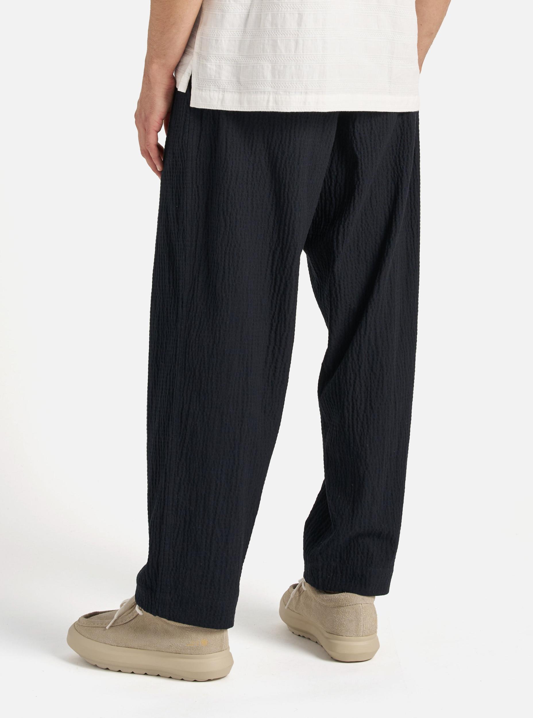 Single pleat front, wide leg trousers with a slight taper. A fuller and larger shape when compared to our Pleated Track Pant. Our model is 6' 0'' with a 32’ Waist and is wearing a size ‘32.’ A simply woven, airy fabric in a blend of upcycled fibres to create a fabric with a seersucker effect and a dry hand feel. The blend of fibres gives a slight marl effect to the rich navy base. • Wide loose leg. • Elasticated and drawstring waist. • Button fly. • Single pleat front. • Two rear pockets: buttoned flap & button jetted. • Two front pockets with internal ticket pocket. • Fabric Composition: 65% Recycled Cotton, 25% Recycled Polyester, 5% Viscose, 4% Other Fibres, 1% Elastane. Trim: 100% Cotton. • Washcare: Do not machine wash. Do not bleach. Do not tumble dry. Warm iron. Dry clean only. Do not iron decoration. • Please be aware that the measurements above are technical measurements that are based on the garment laid flat and are useful as a general guide only. Measured in Centimetres. 26 28 30 32 34 36 38 Outside Leg Including Waistband. 98 98 98 101 105 108 108 Waist. 33.3 34.5 37 39.5 42 44.5 47 Thigh - 2.5cm Below Crotch. 37.5 38.5 40 41.5 43 44.5 46 Hem Opening Width. 22 22 22 23 24 25 26 Front Rise Including Waistband. 29 30 31 32 33 34 35 Back Rise Including Waistband. 44 45 46 47 48 49 50
