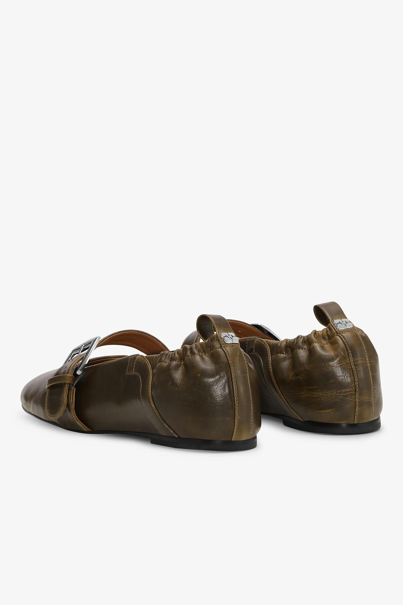 These ballerina flats feature a slip-in style design with pull tabs and buckle strap closing detail.