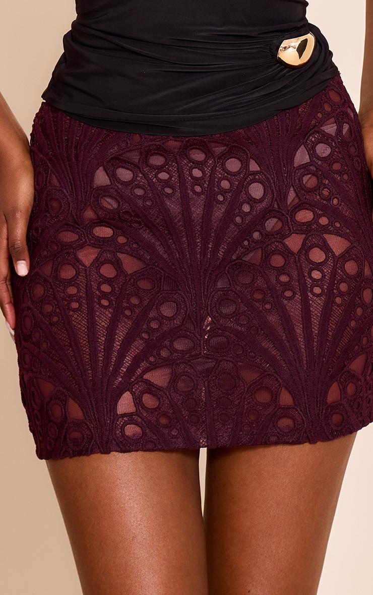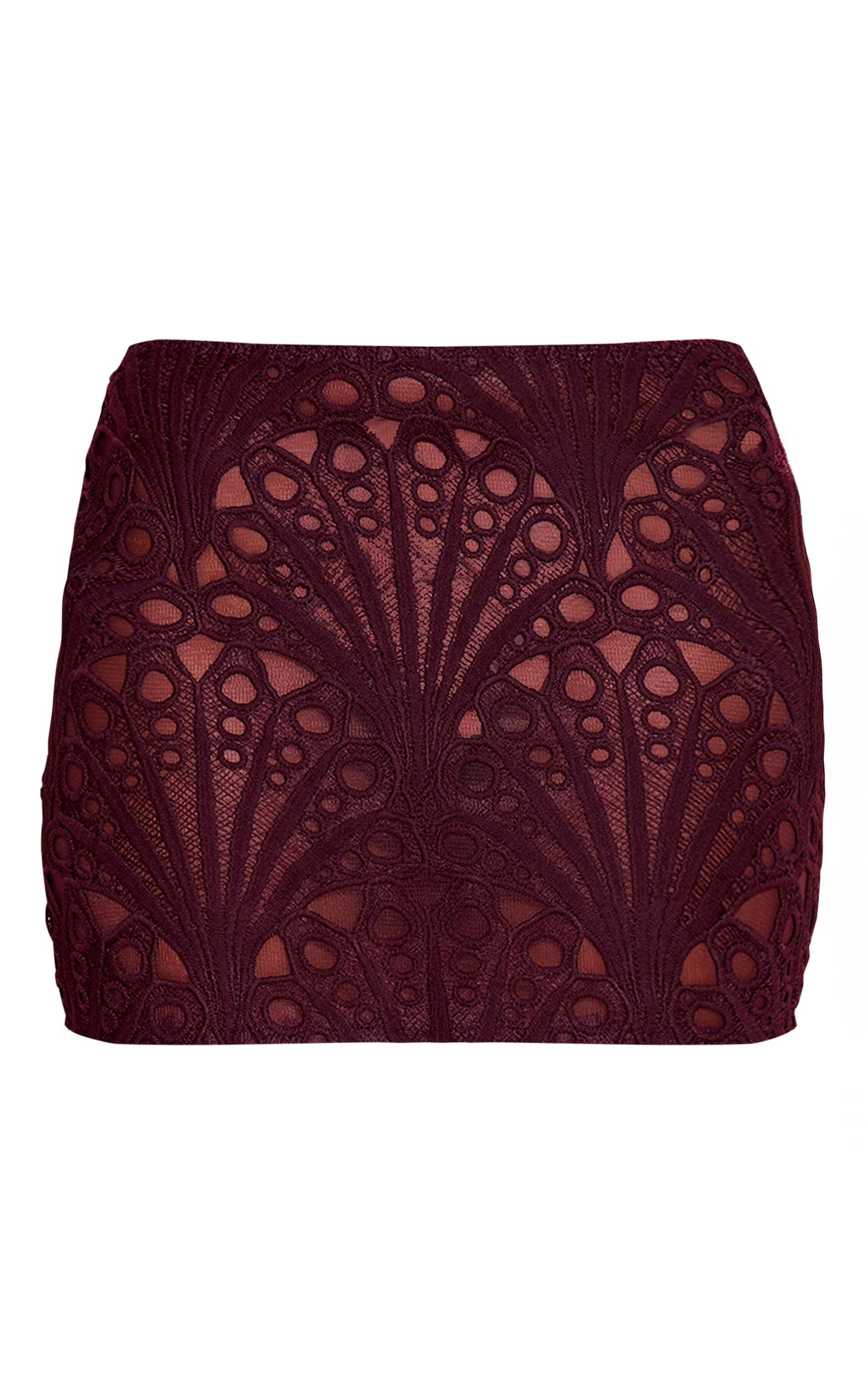 The dark plum textured floral lace mini skirt is saturated in romantic richness. Intricate lace detailing overlays mid-weight lining for depth and structure. Perfect with a sleek black top and metallic accessories for moody evening styling, or lighten with soft sweaters for early fall charm.Length approx 33cm/13inch (Based on sample size US 4)Model wears size UK 8/ EU 36/ AUS 8/ US 4Model Height - 5ft 9inchp]:!mb-4inch>Category: BottomsProduct type: Mini SkirtColor: Dark PlumMaterial: Woven LaceDesign: PlainOccasion: Occasion