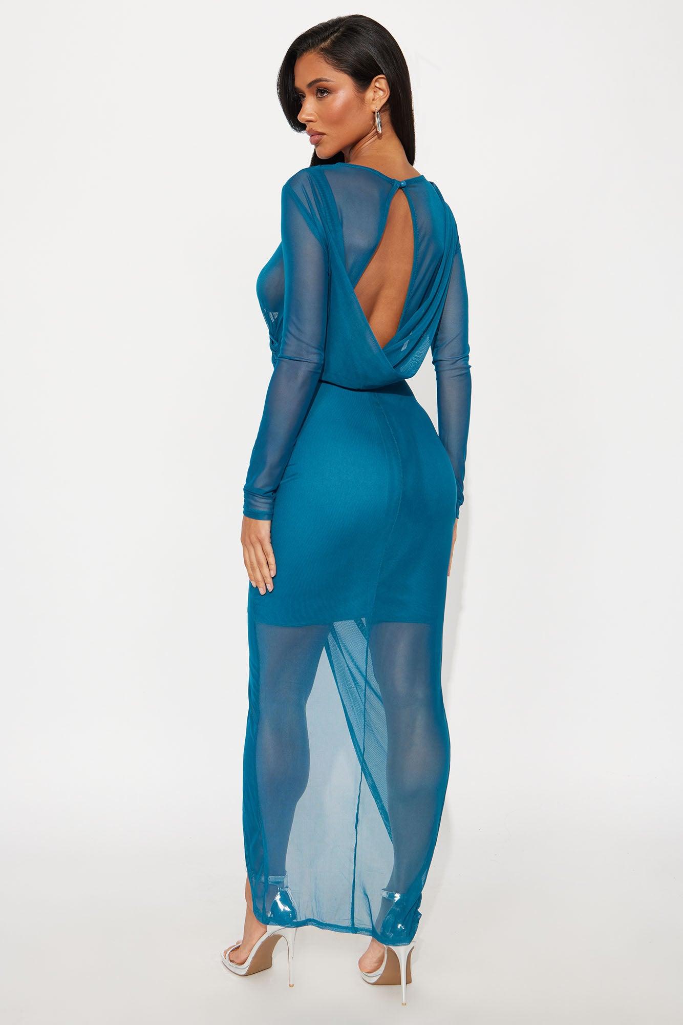 Available In Teal. Mesh Maxi Dress Long Sleeve High Neckline Drape Detail Open Back Back Cowl Detail Double Mesh Lined Stretch Self: 95% Polyester 5% Spandex Lining: 100% Polyester Imported California Proposition 65WARNING: Cancer and Reproductive Harm - www.P65Warnings.ca.gov.