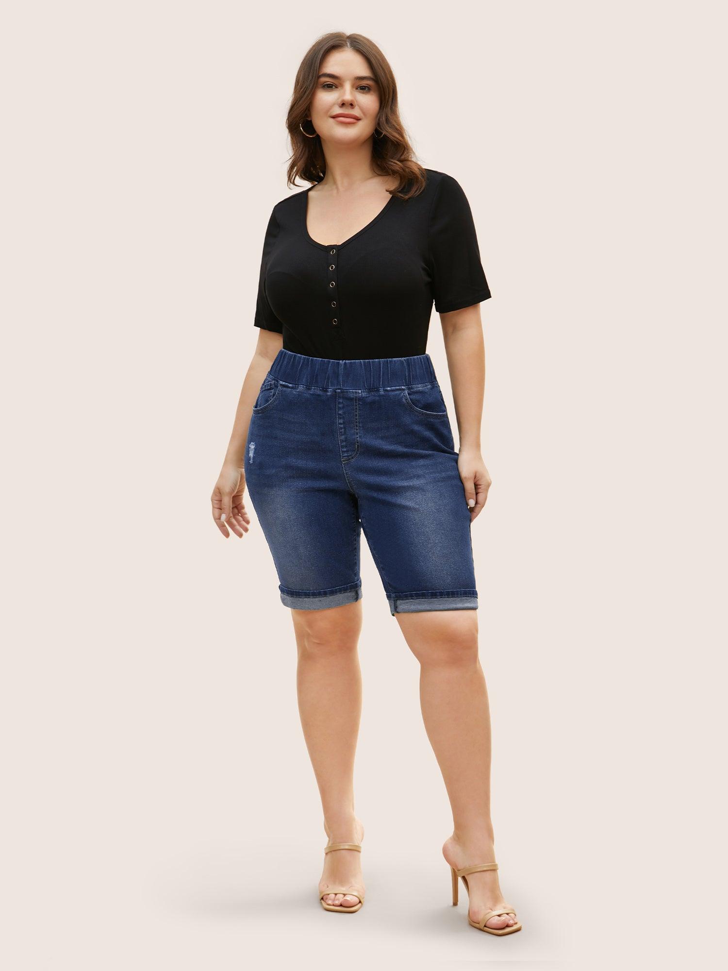 Shop Dark Wash Distressed Roll Hem Denim Shorts now and redefine your style with confidence at BloomChic. Tailored for mid and plus-size women. This trendy Denim Women, sizes 10-30. Season:Summer;Color:Bluevintage,Denimindigo;Style:Casual Everyday;Details:Distressed, Roll Hem;Pocket:Slanted pocket;Belt:No-belt;Wash:Dark Wash;Structural function:Pull-On