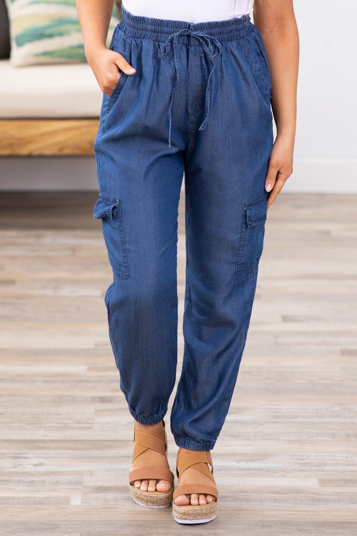 Product Details Colors: Dark Wash Print: Solid Style: Joggers Color Season: Summer Material and Care 100% Tencel Hand Wash Cold Line Dry Size and Fit Rise: 12" Inseam: 24" Small: Waist 28" Medium: Waist 30" Large: Waist 32" Model is 5'1 and wearing a size small