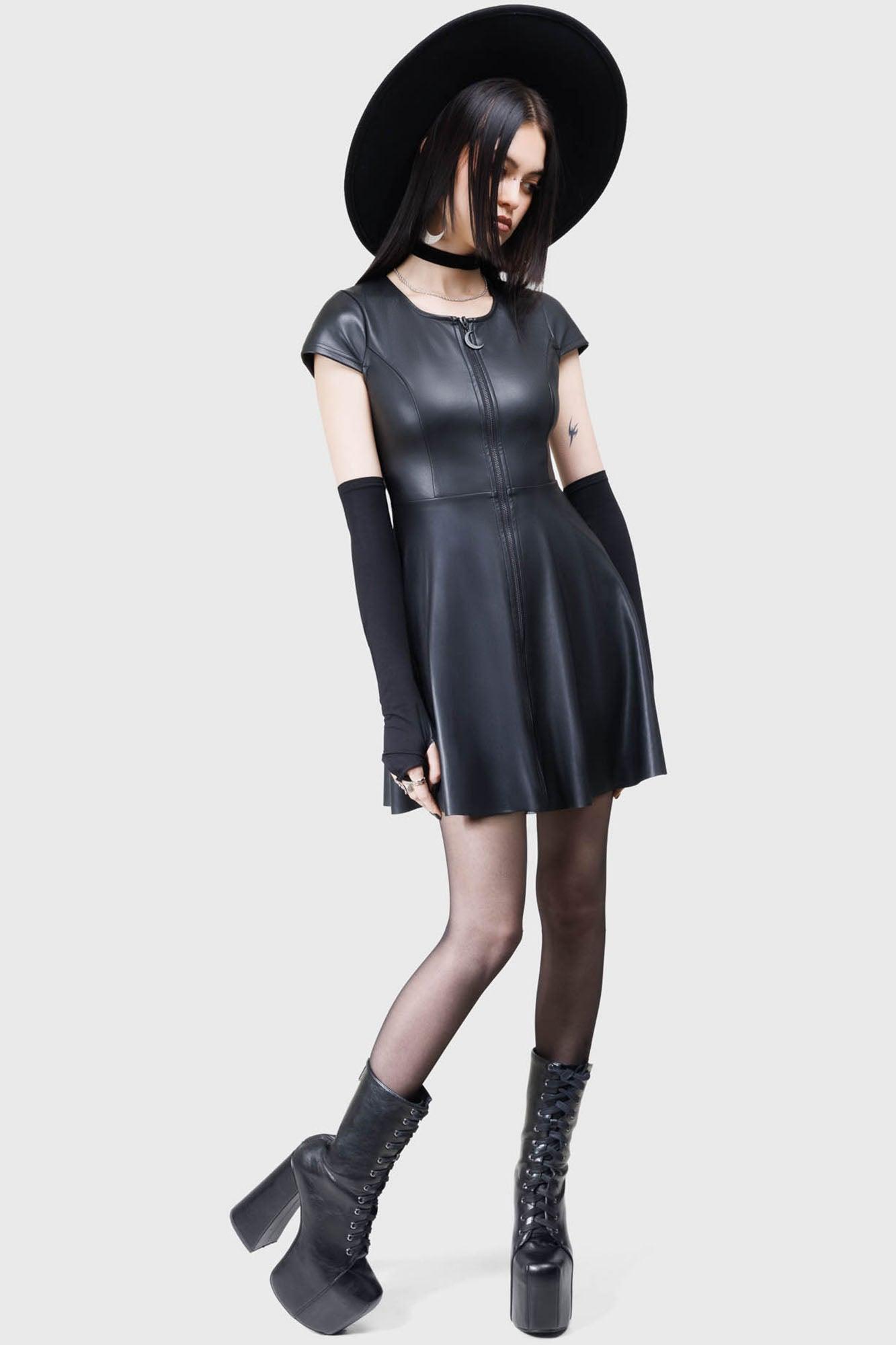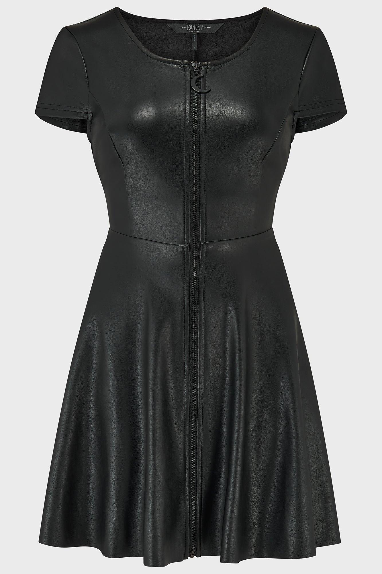 DARK WHISPER.- Soft PU.- Zip-front with crescent moon pull.- Short sleeves.- Black hardware.- Round neckline.- Fit and flare.Model is 5'8 and wears a size XS.With KIHILIST branding, 63% Polyurethane 37% Polyester.Machine wash cold (30°c) / Do not bleach / Do not tumble dry / Iron at low temperature / Do not dry clean. Imported.