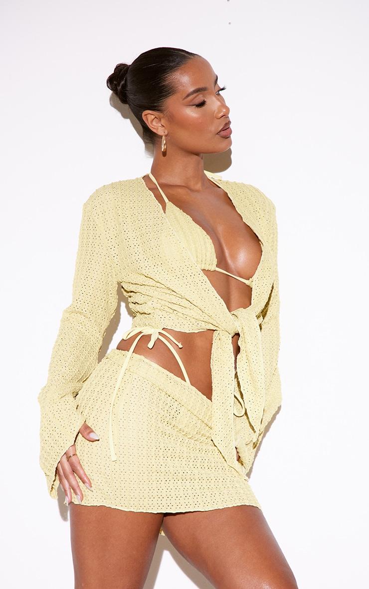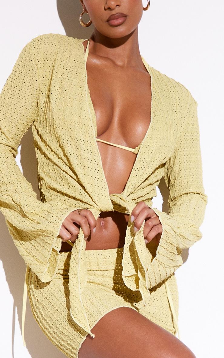 Get ready for your vacay with this dark yellow textured crochet bell sleeve tie front shirt and be sure to steal all the stares. Made from a dark yellow textured crochet material with bell sleeves and a tie front, we're obsessed. This shirt is the perfect partner to your poolside look and is sure to gain all the compliments. Pair with your fave bikini set, some oversized shades and your everyday jewelry pieces for a vibe that won't go unnoticed. Length approx 52cm/20.5inch (Based on a sample size UK 8) Model wears size UK 8/ EU 36/ AUS 8/ US 4 Model Height - 5ft 7inch Length may vary due to crochet knit Model Height - 5ft 7inchp]:!mb-0inch>Category: SwimwearProduct type: Beach ShirtColor: Dark YellowDesign: PlainOccasion: Day