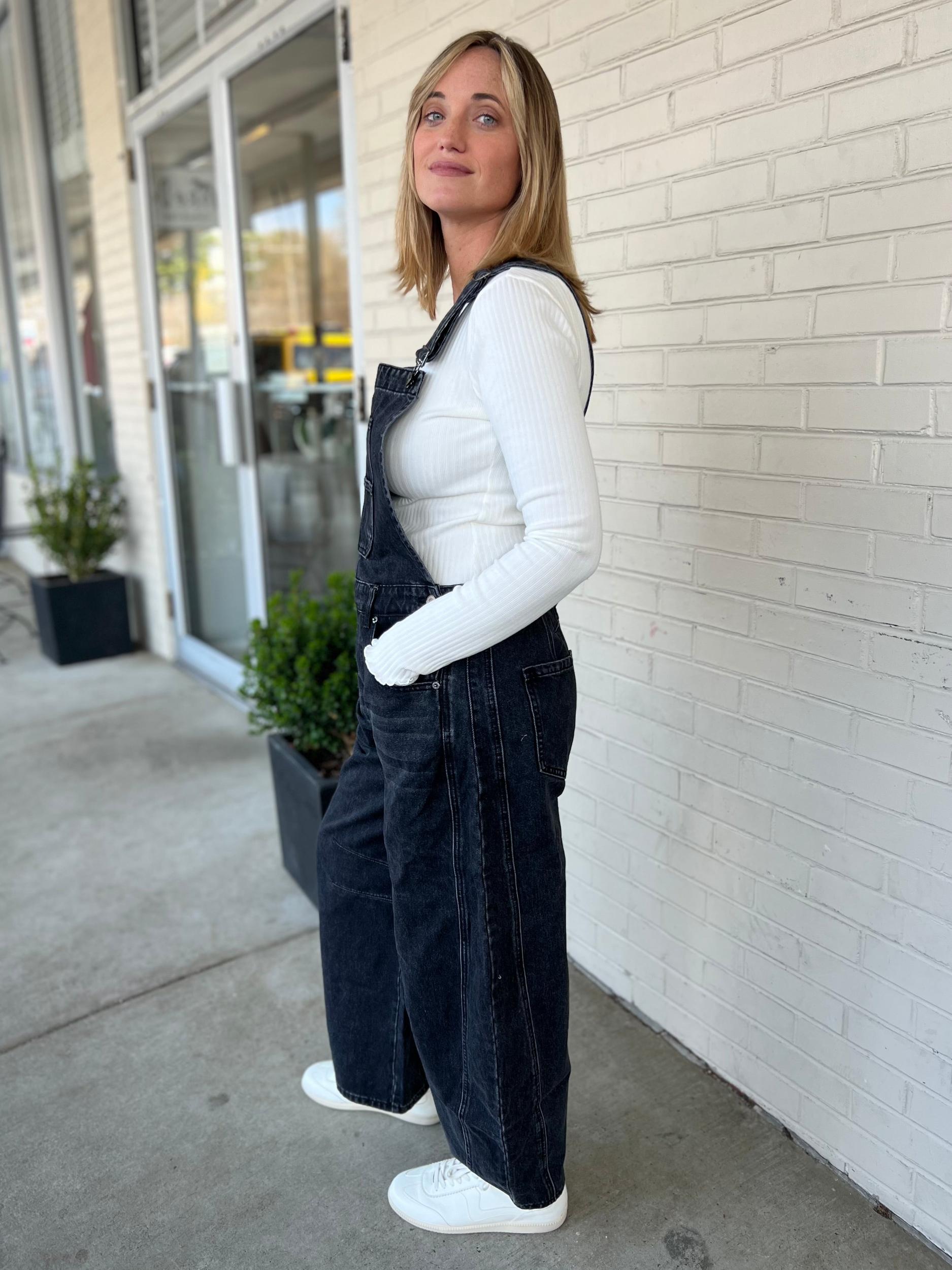 Introducing Darla Overalls - black, wide-legged denim overalls, with flattering pockets and sleek dark slate buttons. Perfect for a playful weekend look or a night out on the town. (And no, we won't be surprised if you wear them more than once in a week!)