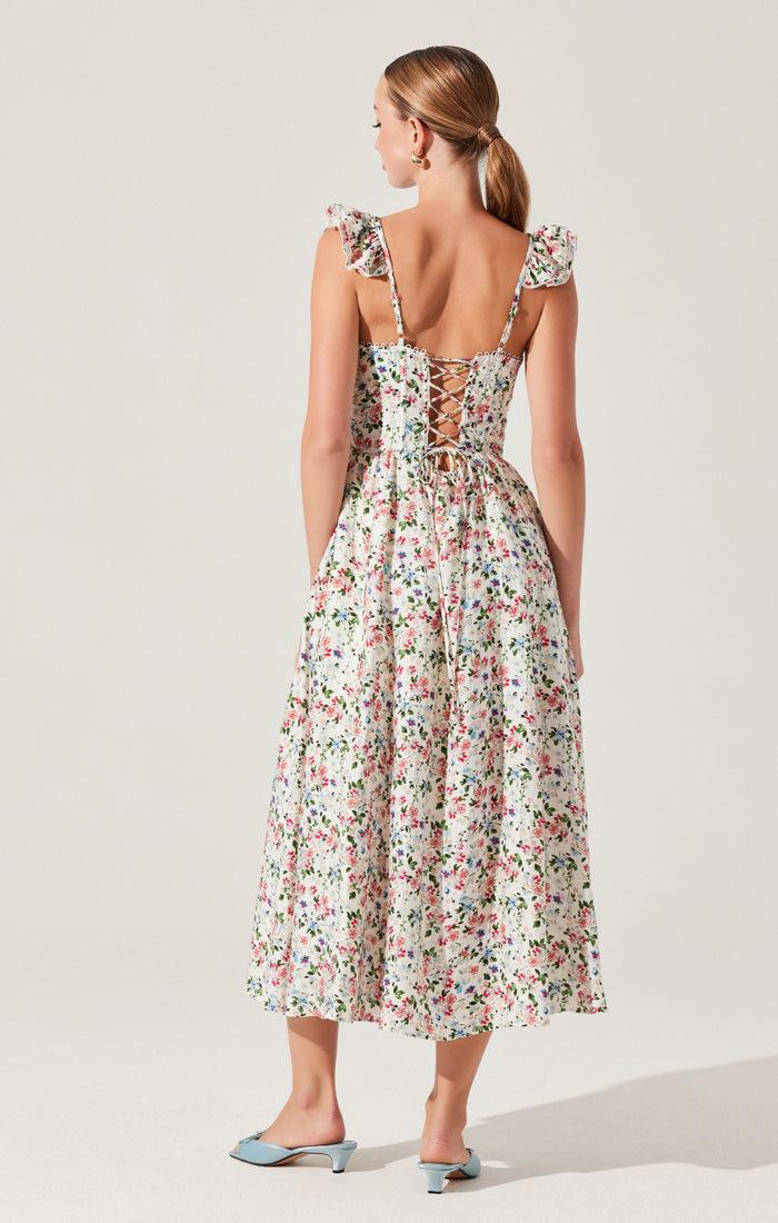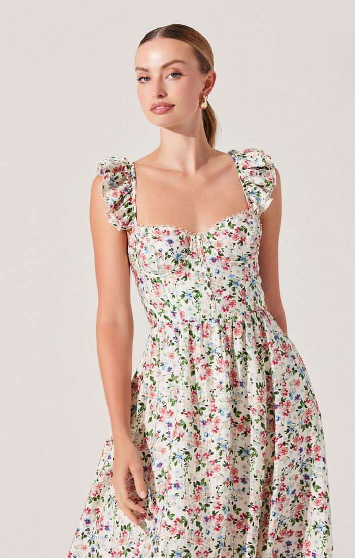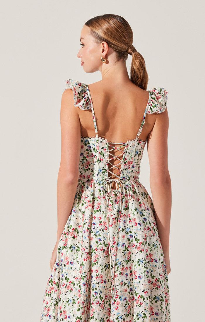 The Darla Dress is darling!! The floral print really pops against the cream. It also has a sweet ruffle sleeve and a tie up adjustable back. This is a perfect spring and summer dress.