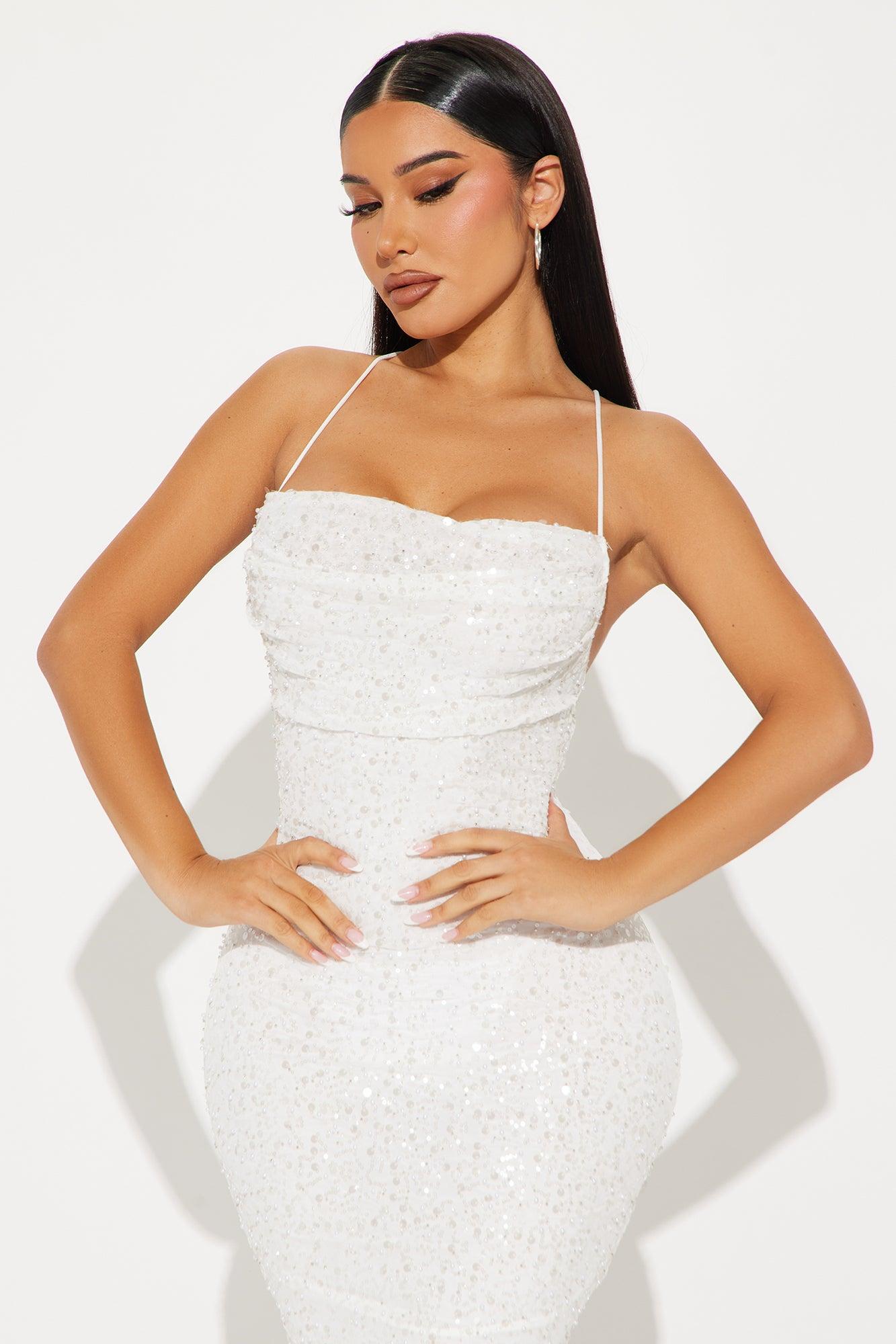 Available In Ivory. Sequin Midi Dress Bungee Straps Square Neckline Tie Back Backless Back Slit Lined Stretch Shell: 100% Polyester Lining: 95% Polyester 5% Spandex Imported