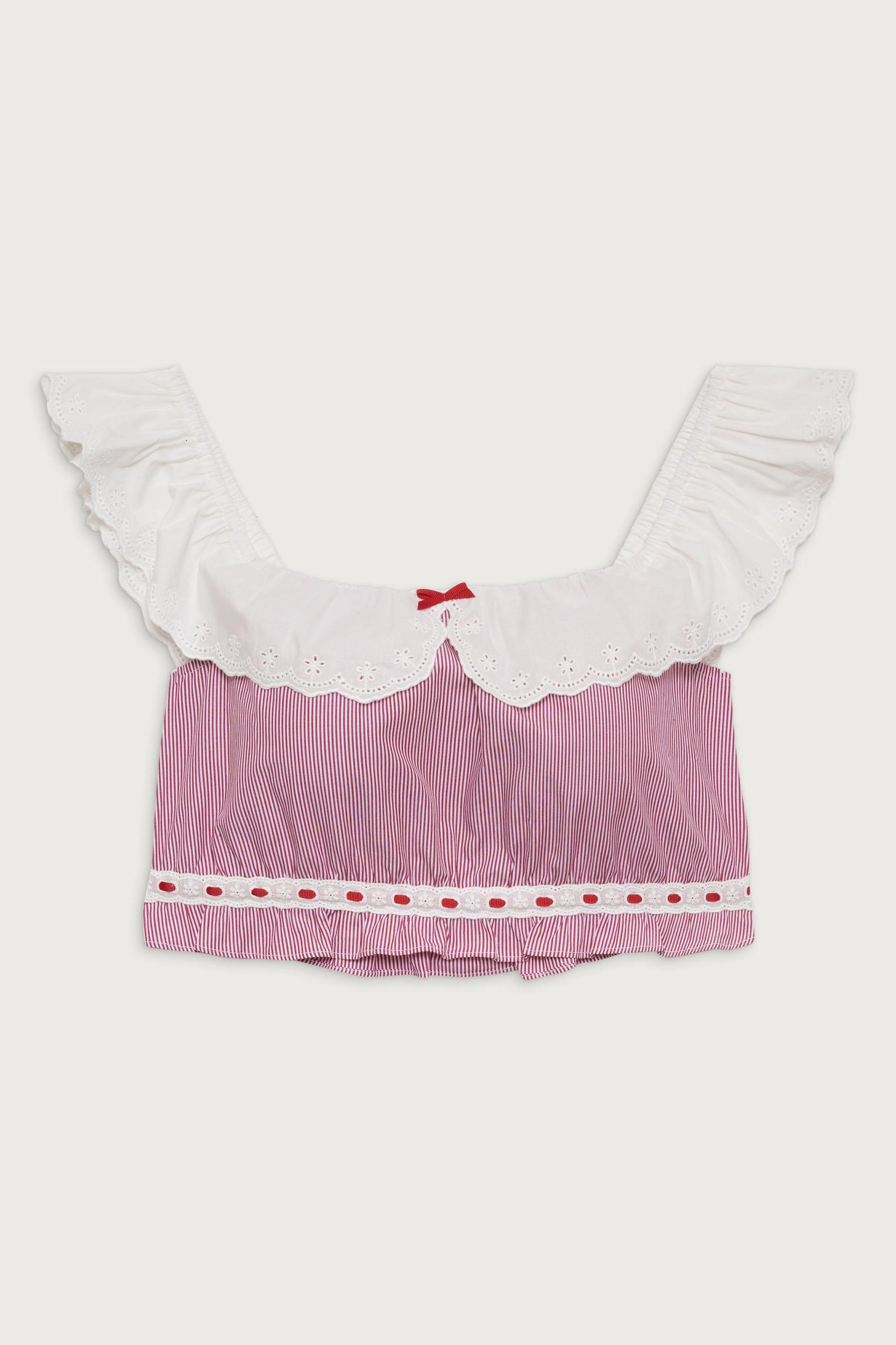 The Darling crop top is designed with embroidered eyelet ruffles and a center bow detail. This red and white striped top is made from soft washed poplin fabric and can be worn on or off the shoulder for a flirty summer look. Pair with the matching Darling striped skirt for a perfectly coordinated outfit. Fabric 100% Cotton Poplin Yarn Dyed Stripe Model Size & Fit This style runs true to size Riley is wearing a size Small Height 5’9” (176m) 34" (86cm), Waist 25" (64cm), Hips 36" (92cm)