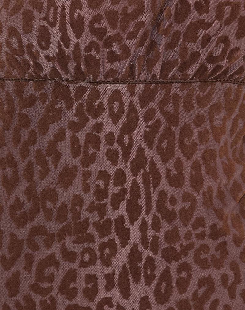 Maxi length dress with cami straps, low square neckline and ruching detailed under-bust and figure hugging fit, in a rar leopard flocked fabric in a chocolate brown colour. MODEL WEARS SIZE: EXTRA SMALL - MODEL HEIGHT:5'7