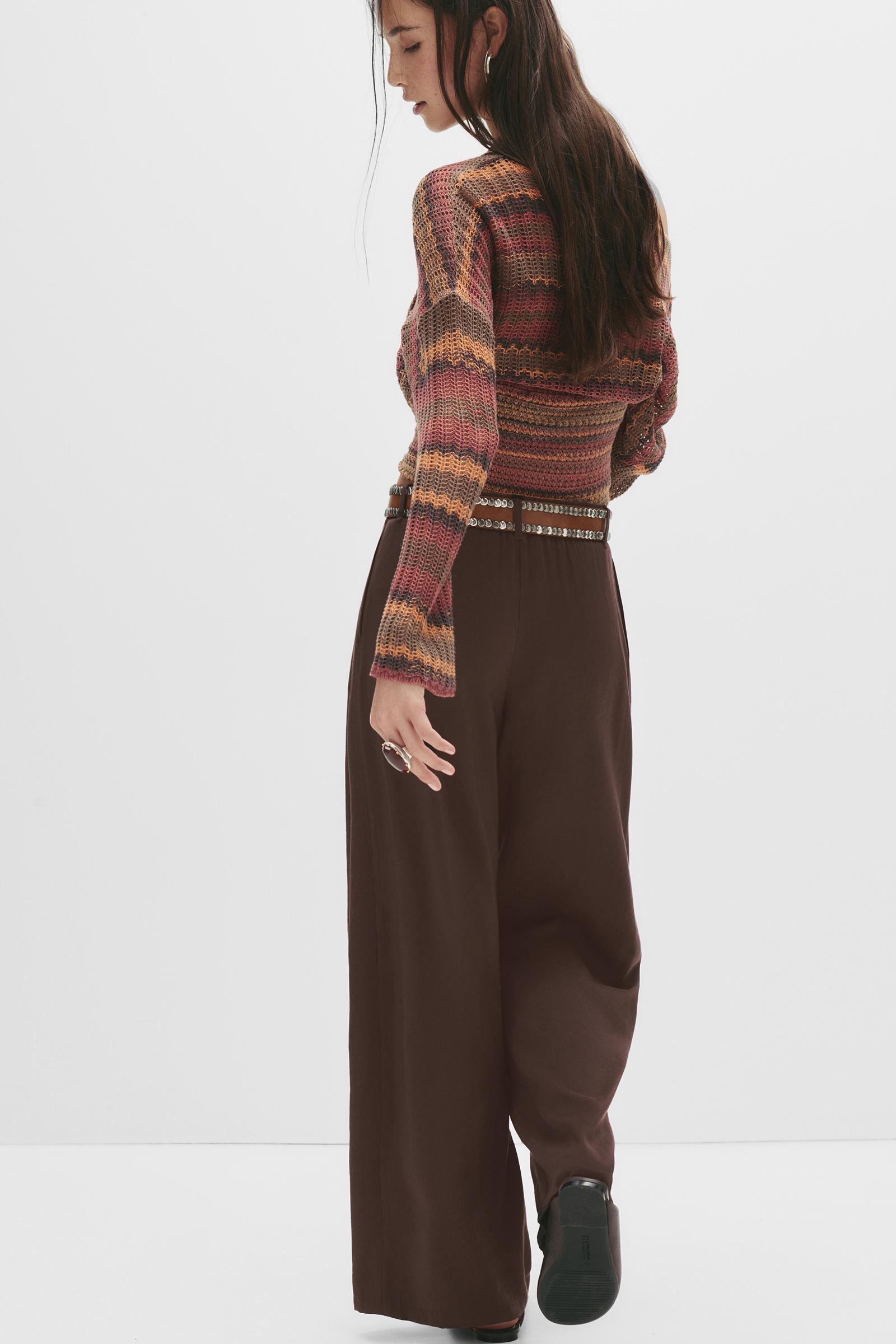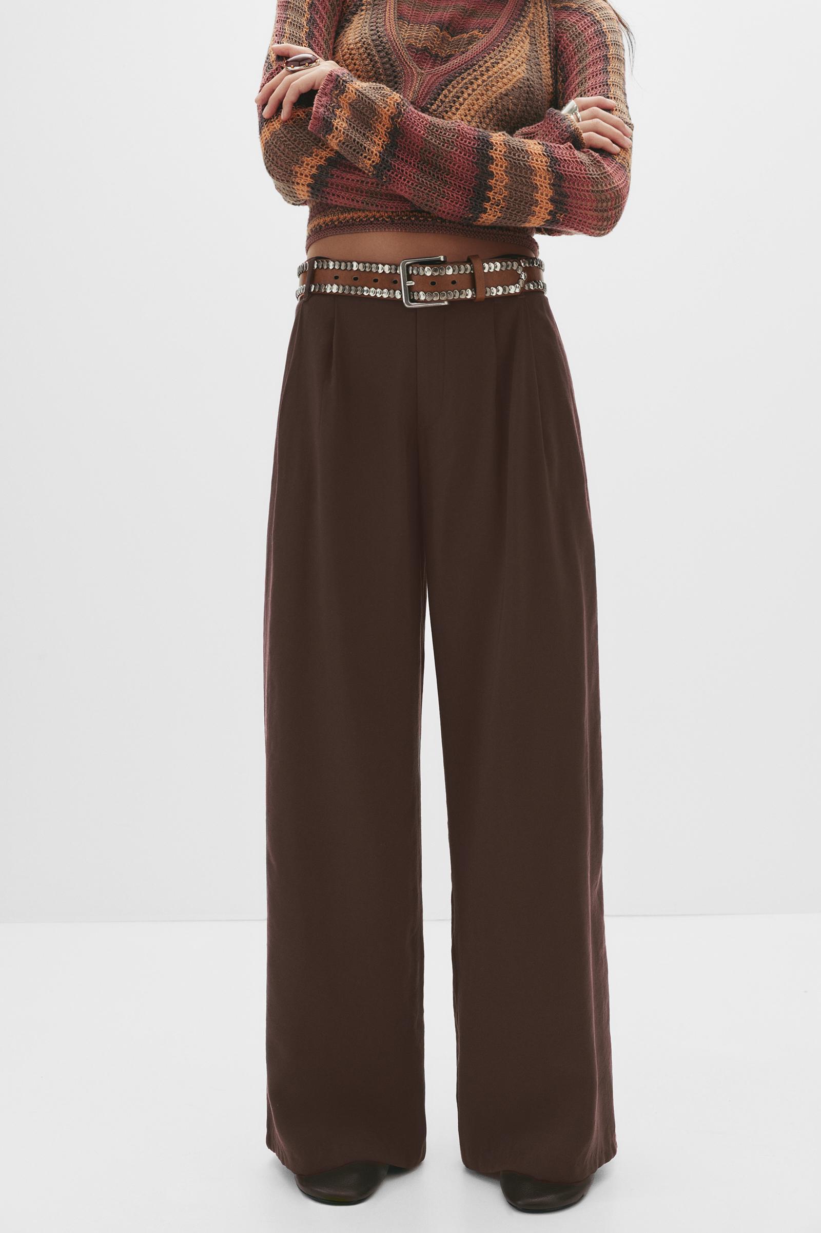 Flowing wide leg pants with darts, belt loops and zipper fastening.
