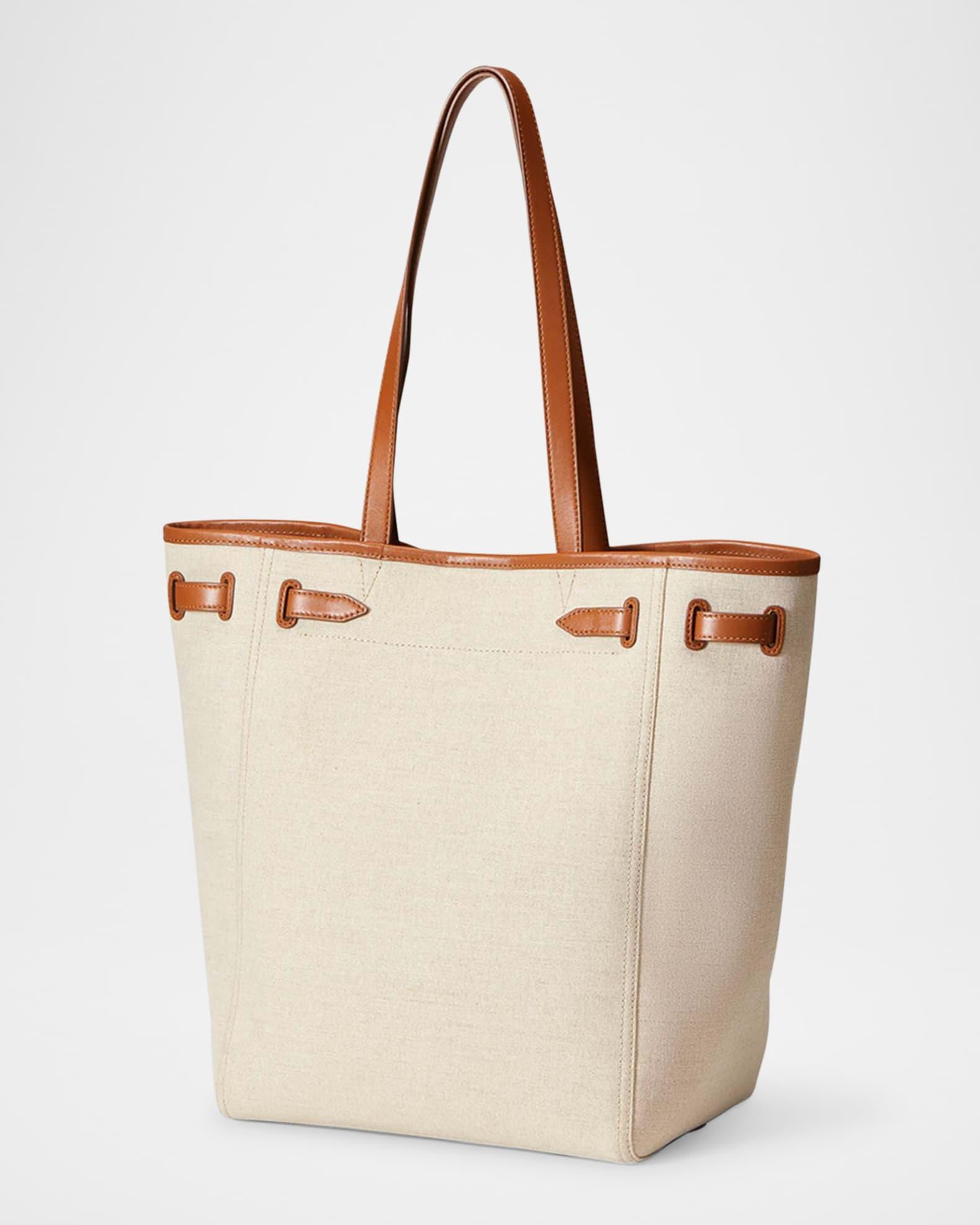 Veronica Beard "Dash" north-south tote bag in leather and canvas Shoulder straps, 11.4" drop Open top with magnetic closure; adjustable center buckle strap Interior, one zip pocket, two slip pockets Approx. 14.2"H x 17.3"W x 7.5"D Linen/cotton/polyurethane Spot clean Imported Care Instructions: The Veronica Beard handbag collection is produced with the utmost care, using luxury materials, exceptional craftsmanship, and thoughtful design. Due to the delicate nature of the leather used, please note that it may scratch or crease over time. To preserve its finish, please avoid rough surfaces when handling this product. Store in a cool, dry place and wipe any surface dirt with a dry cloth