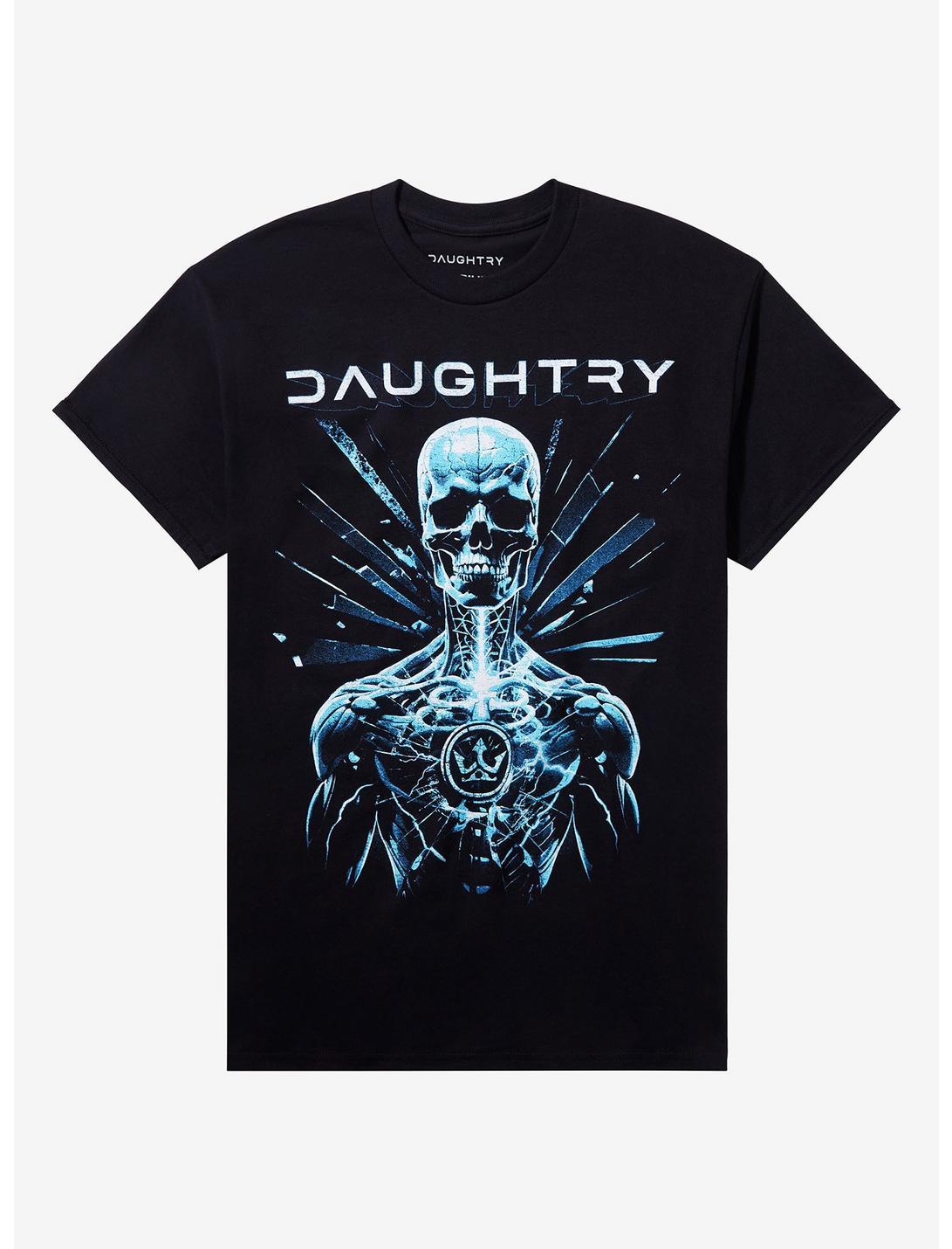 Daughtry's been rocking for two decades. This black tee shows a blue-tinged skeleton with the band's crown symbol stamped on its rib cage. The band's logo appears above.100% cottonWash cold; dry lowImportedListed in men's/unisex sizes