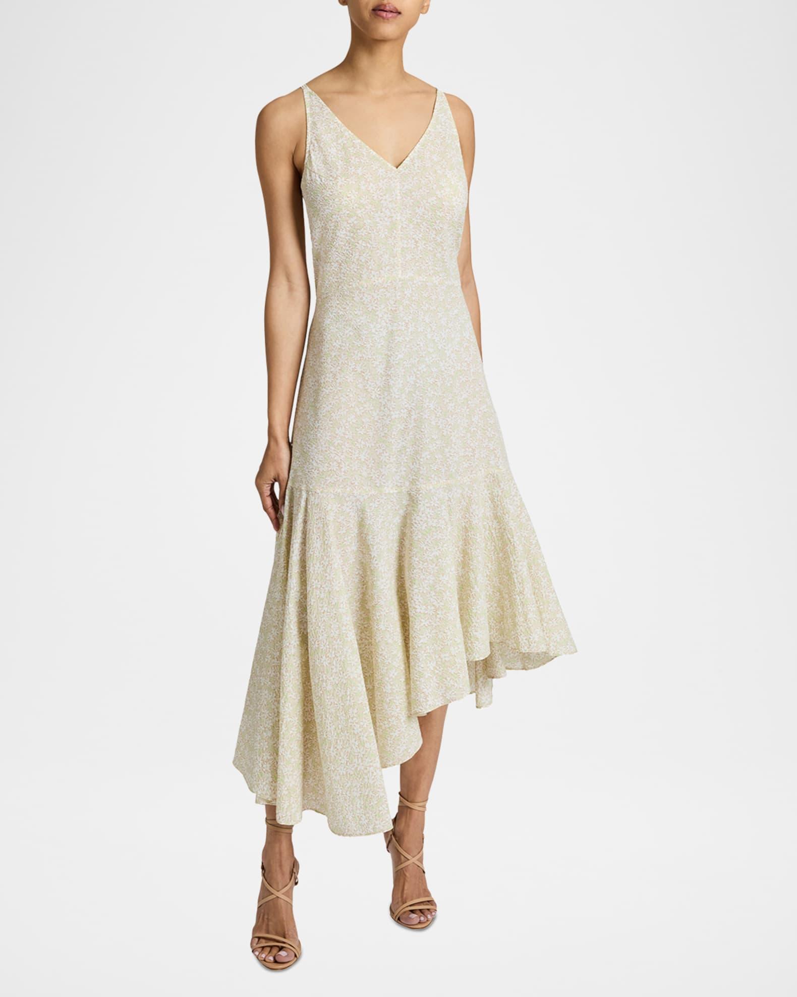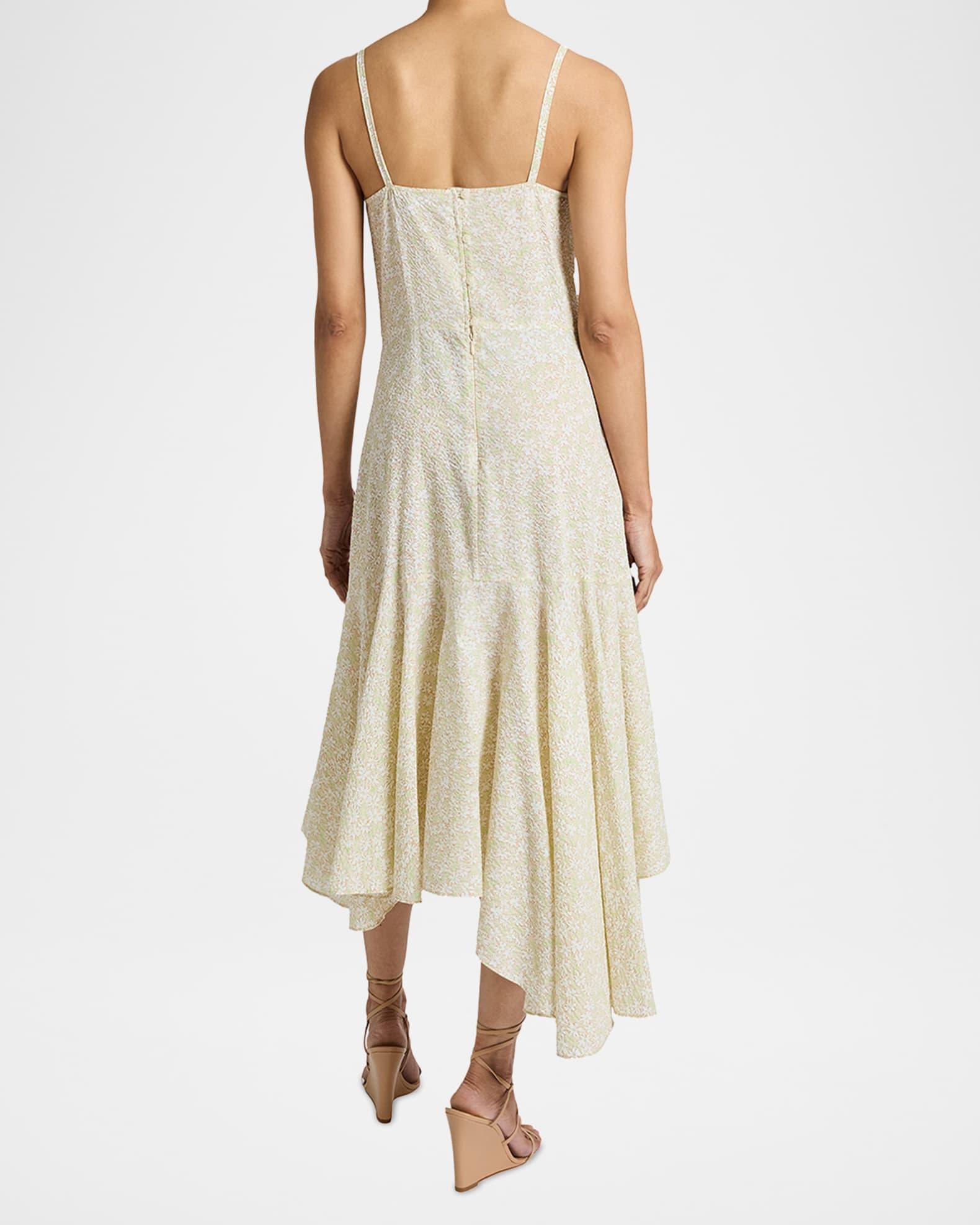 Santorelli "Davin" midi dress in lightweight floral cotton seersucker with fluid draping hem Approx. 52"L from shoulders to hem V neckline Sleeveless High-low hem Hem falls below the knee A-line silhouette Back button closure Invisible back zipper Cotton Unlined Dry clean Imported