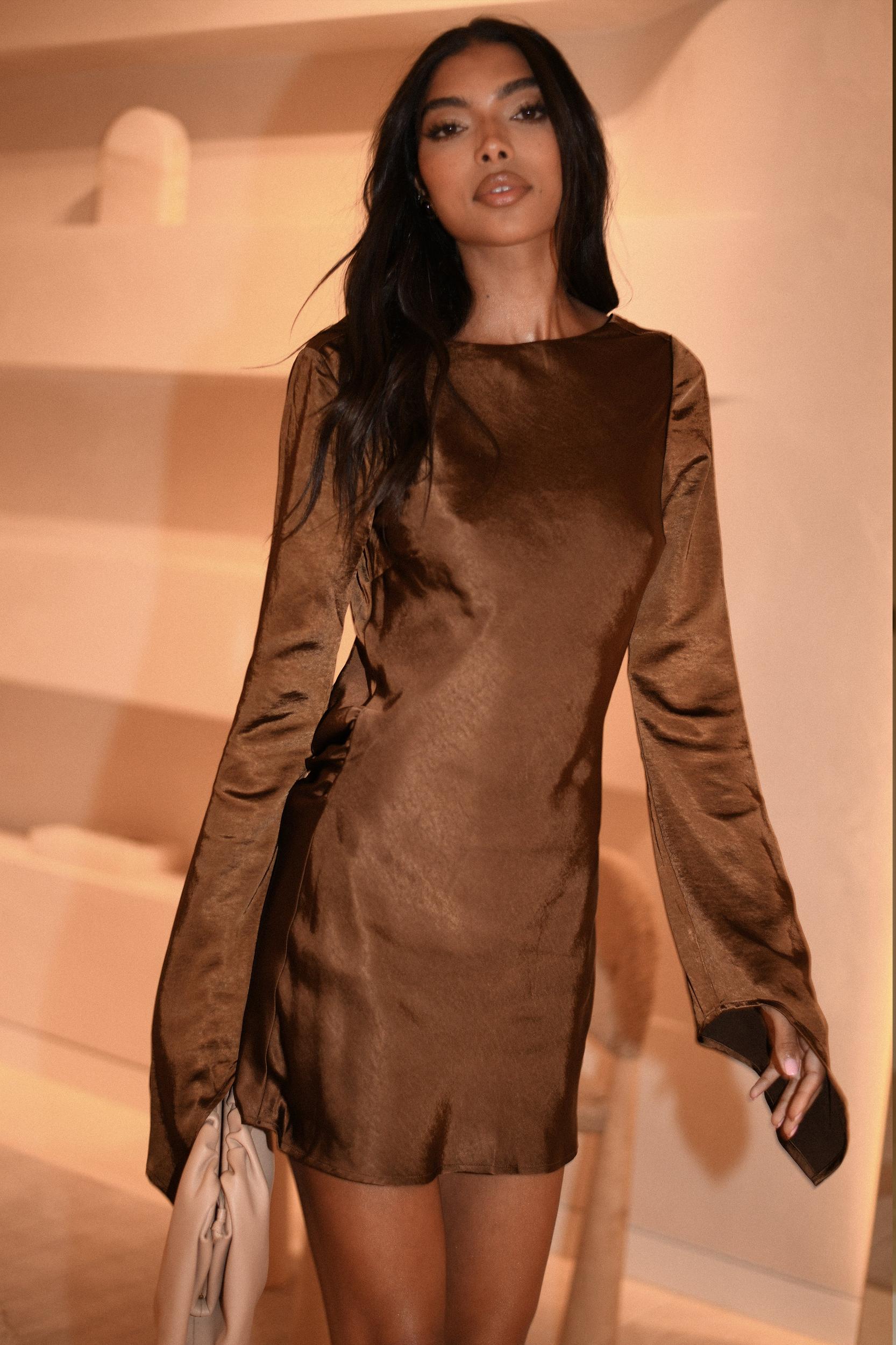 We recommend sizing down in this style. In bloom. This satin mini dress features a low, open back, a high boat neckline, and asymmetrical bell sleeves. A back cowl adds visual texture to the seamless finish. Fresh, fun, and flirty, its smooth, lined fabric is as comfortable as it is flattering. Pair it with our Brandy Ankle Strap Heels for an ultra-chic look. This dress is considered a Micro Mini Dress and measures shorter than 82cm from shoulder point.