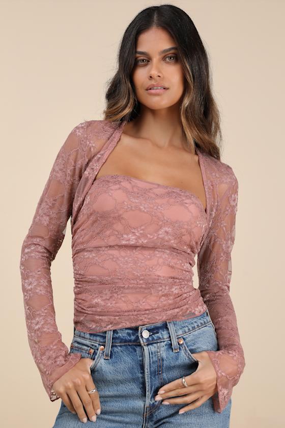 Trendsetting and always ready for a first date, this dynamic lace top starts with a figure-hugging strapless bodice with flattering ruching along the sides. The matching shrug features long fitted sleeves, offering versatile styling depending on your mood, plans, or the season!