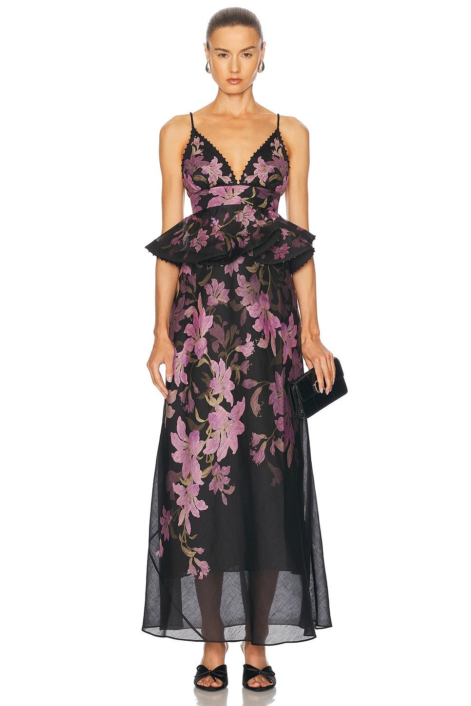 dressSelf: 52% linen, 48% silkLining: 100% cotton / Made in China / Dry clean only / Fully lined / Hidden back zipper closureBack hook and eye clasp closures / Adjustable shoulder straps / Linen blend fabric with ruffle detail / Our Style No. ZMER-WD748 / Manufacturer Style No. 3495DS252 / Model is wearing size 1/S