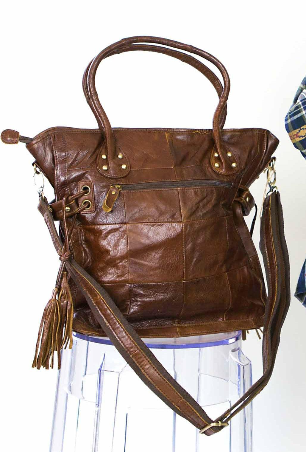 Basket weave patchwork pattern. Large zipper pocket on the back. Double handle tote with removable long sporty strap.