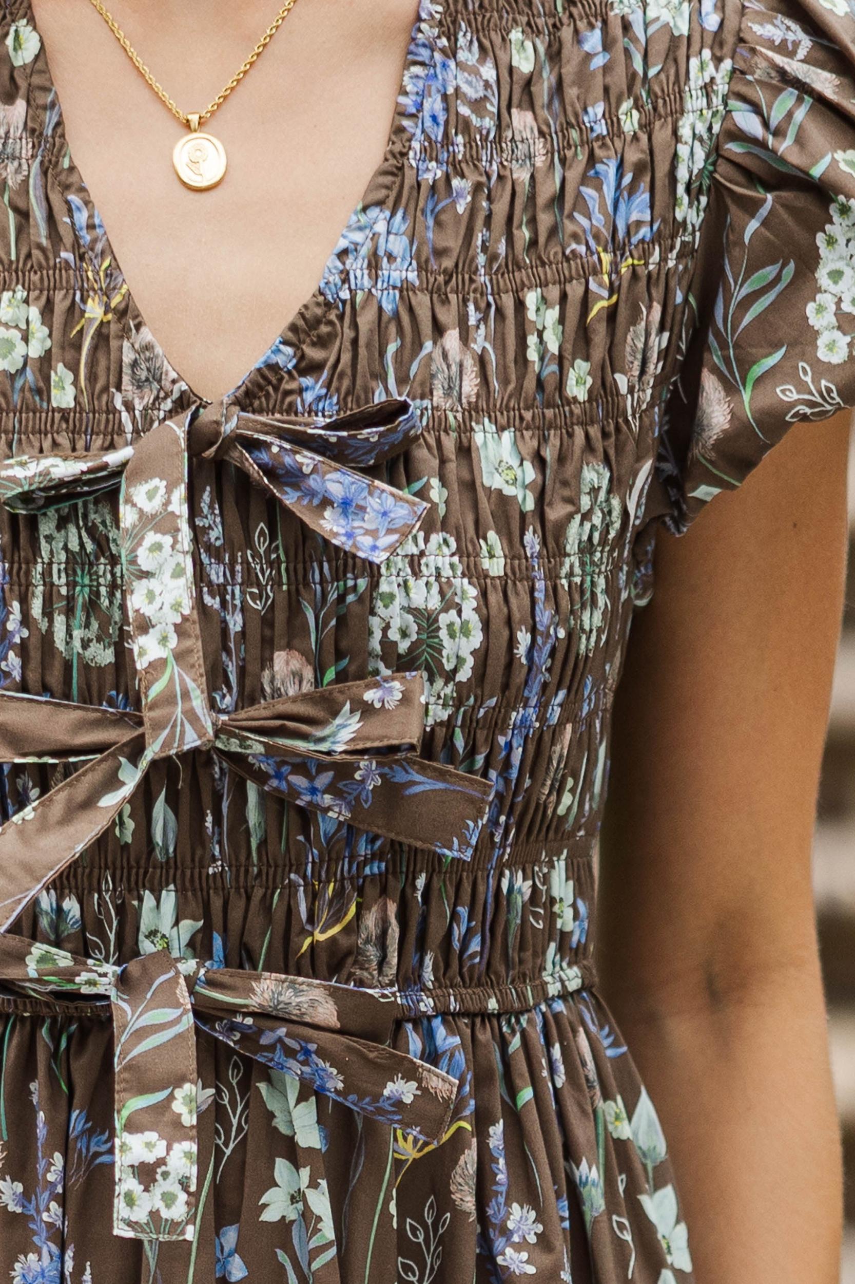 This dress is all about feminine charm with a touch of vintage flair! The v-neckline with ruffle trim and bow accents makes it extra sweet, while the smocked waistline creates a flattering silhouette. Finished with flutter sleeves and a flowy skirt, it’s the perfect pick for brunches, showers, or garden parties. V-neckline Smocked waist Flutter sleeves Midi length Sydney is wearing the small.