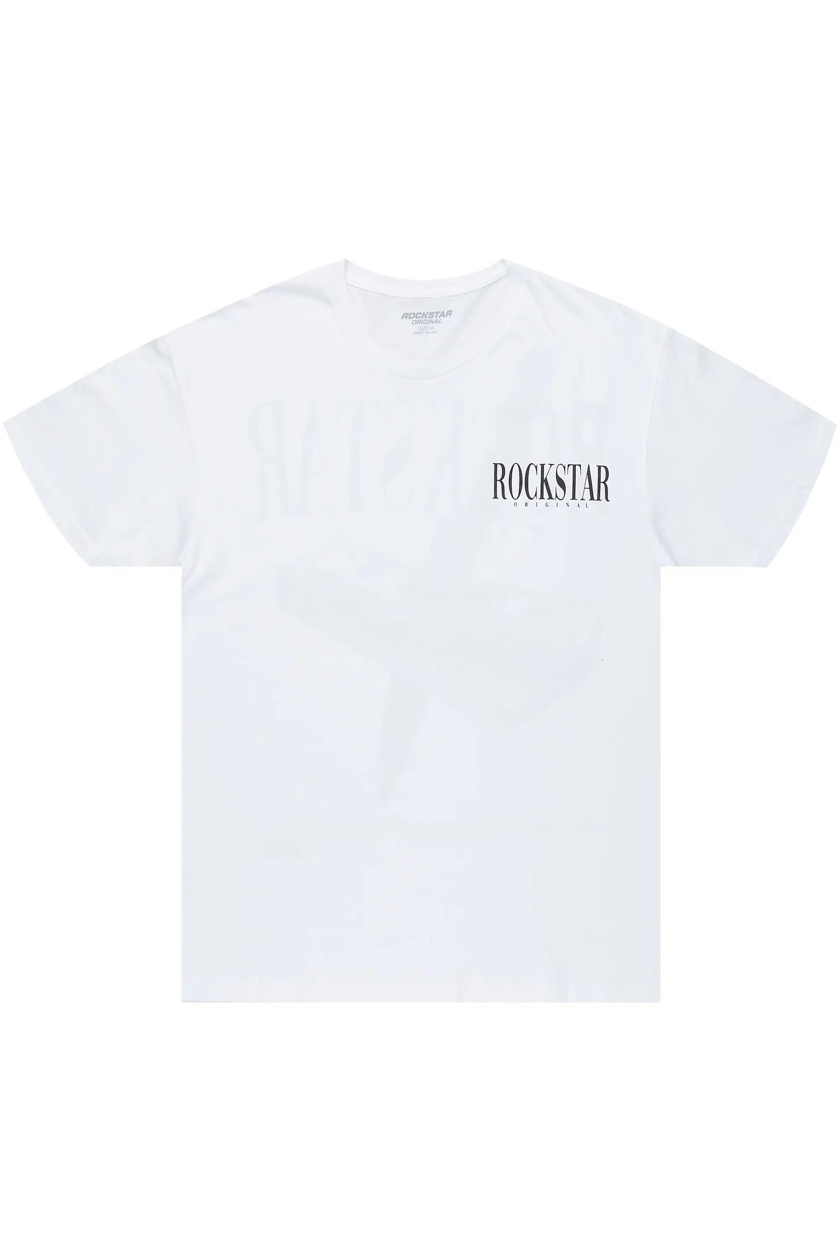 An urban streetwear t-shirt for men in white. Designed with ultra soft fabric and a custom money stack graphic for the perfect staple piece style. Crew neckline Short sleeves Pullover style Relaxed-fit Printed RSO logo Custom money and knife graphic