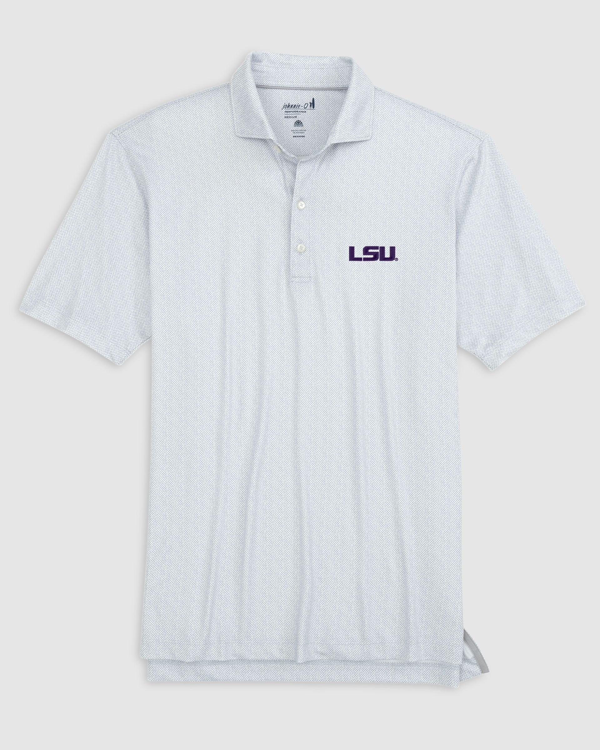 Our classic performance jersey polos are designed to be worn before, during and after the best round youve ever had. Made with a lightweight, moisture-wicking fabric with a comfortable touch of stretch (that also protects with UPF 50), theyre a staple in every closet. The Hinson Polo features a non-solid solid print that offers a little more intrigue than your standard solid polo. Please note that actual logo size may be slightly larger or smaller than pictured. johnnie-O Rice Hinson Jersey Performance Polo.