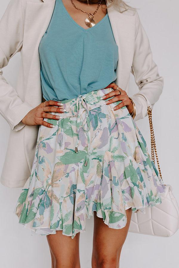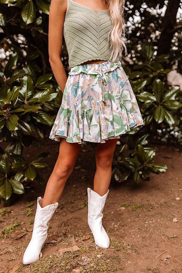 Take on any spring day in style with our flirty 'Daytona Daze Skort' featuring lightweight breezy material patterned with a green and mauve hued floral print, an elastic waistline with a tie closure, and a relaxed silhouette that ends in a ruffled upper-thigh length hemline! Plus, these cuties include sewn in shorts! Measurements S : Hip 30", Inseam 2", Length 15", Waist 24". M : Hip 32", Inseam 2", Length 15", Waist 26". L : Hip 34", Inseam 2", Length 16", Waist 28".