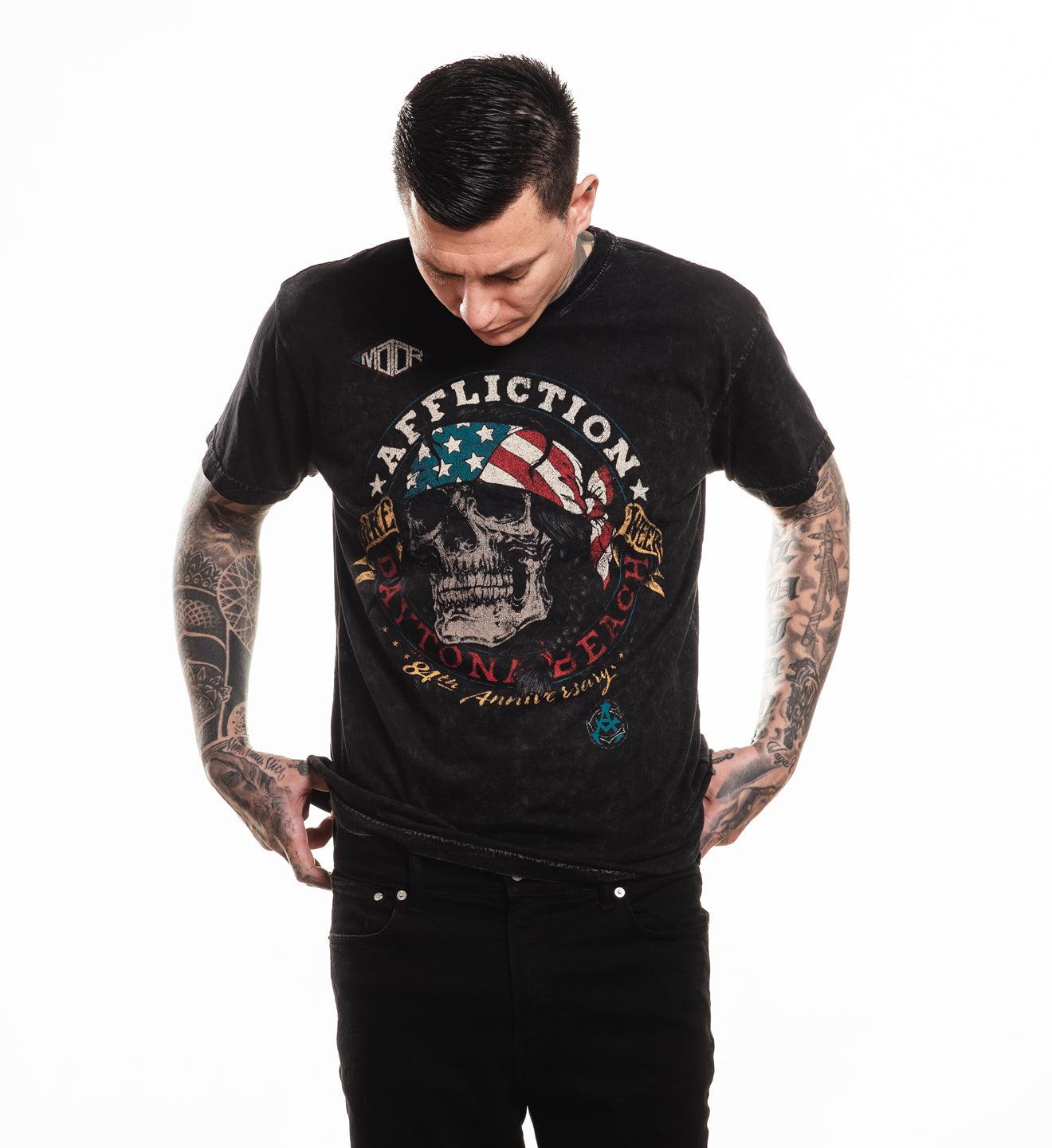Affliction Mens Daytona Outlaw Short Sleeve Tee 100% Cotton Black Lava Wash Color Model wearing size L
