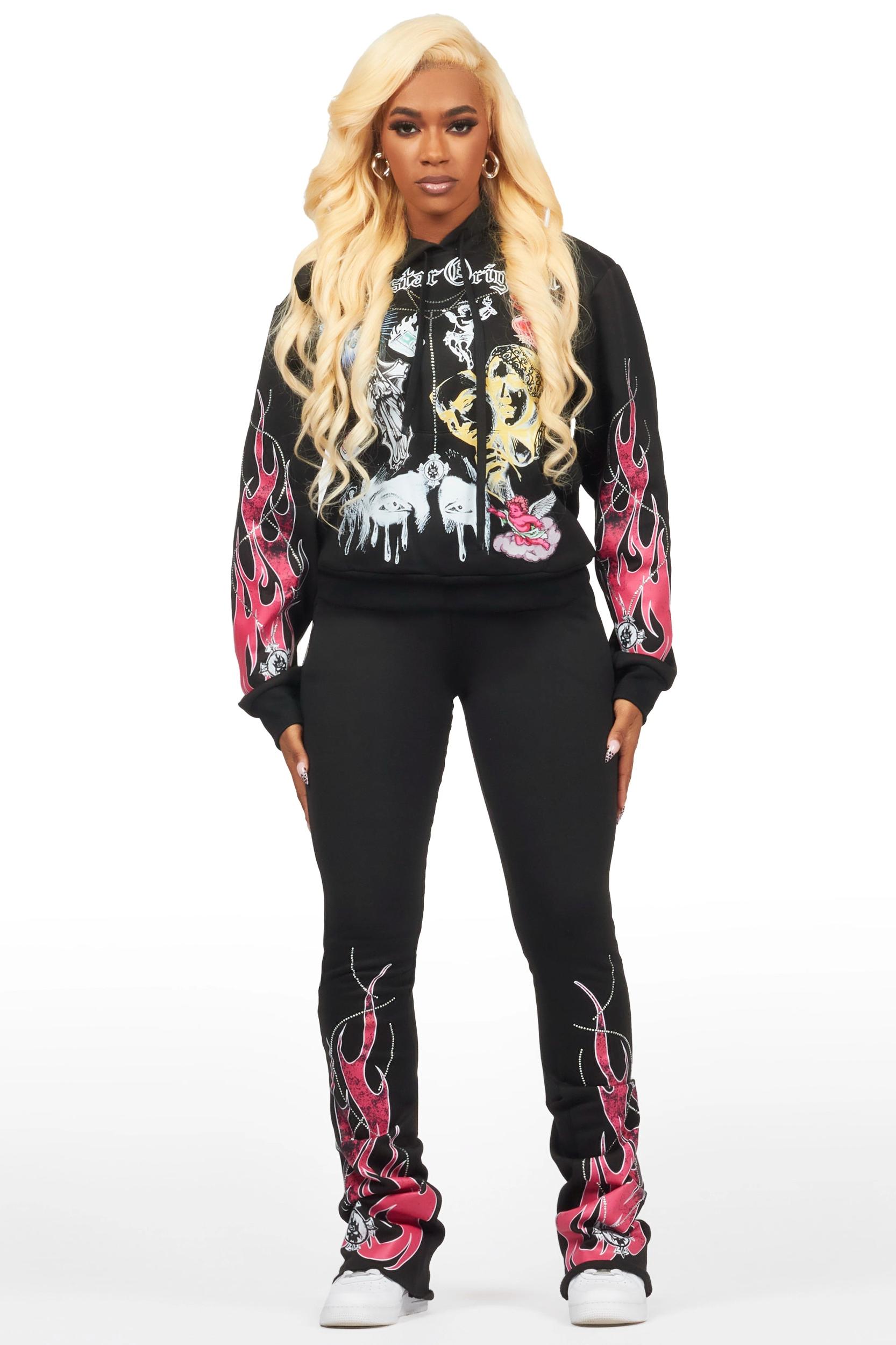 A trendy two-piece super stacked tracksuit set for women in black. Designed with ultra soft fabric for the perfect everyday set. Drawstring hood Ribbed knit trims Kangaroo pocket Printed RSO graphics Rhinestone detailing Drawstring waistband Dual slant pockets Super stacked construction Flare leg openings 42" inseam