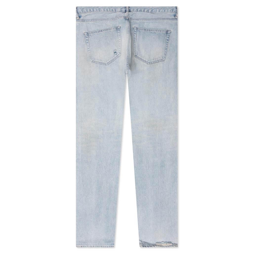 The John Elliott Daze Dartmouth Denim Pants in Dartmouth are crafted from Japanese 3X1 denim in a light indigo wash. They feature a classic straight leg fit with a medium rise and slight taper from the knee. The pants include a five-pocket design with a button fly, showcasing an authentic vintage-inspired wash with sanding and distressing throughout. They also have destroys at the front, back pocket, and back hem, along with classic contrast stitching and a chain-stitched hem. Made in Japan from 100% cotton. 100% Cotton Japanese 3X1 denim Sanding and distressing throughout Vintage inspired wash Classic contrast stitching Style no: G512E75570L
