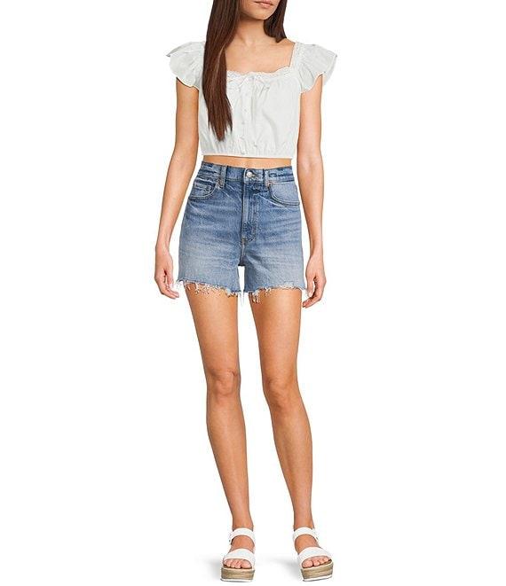 Daze The Knockout Distressed Frayed Hem High Rise Denim Shorts