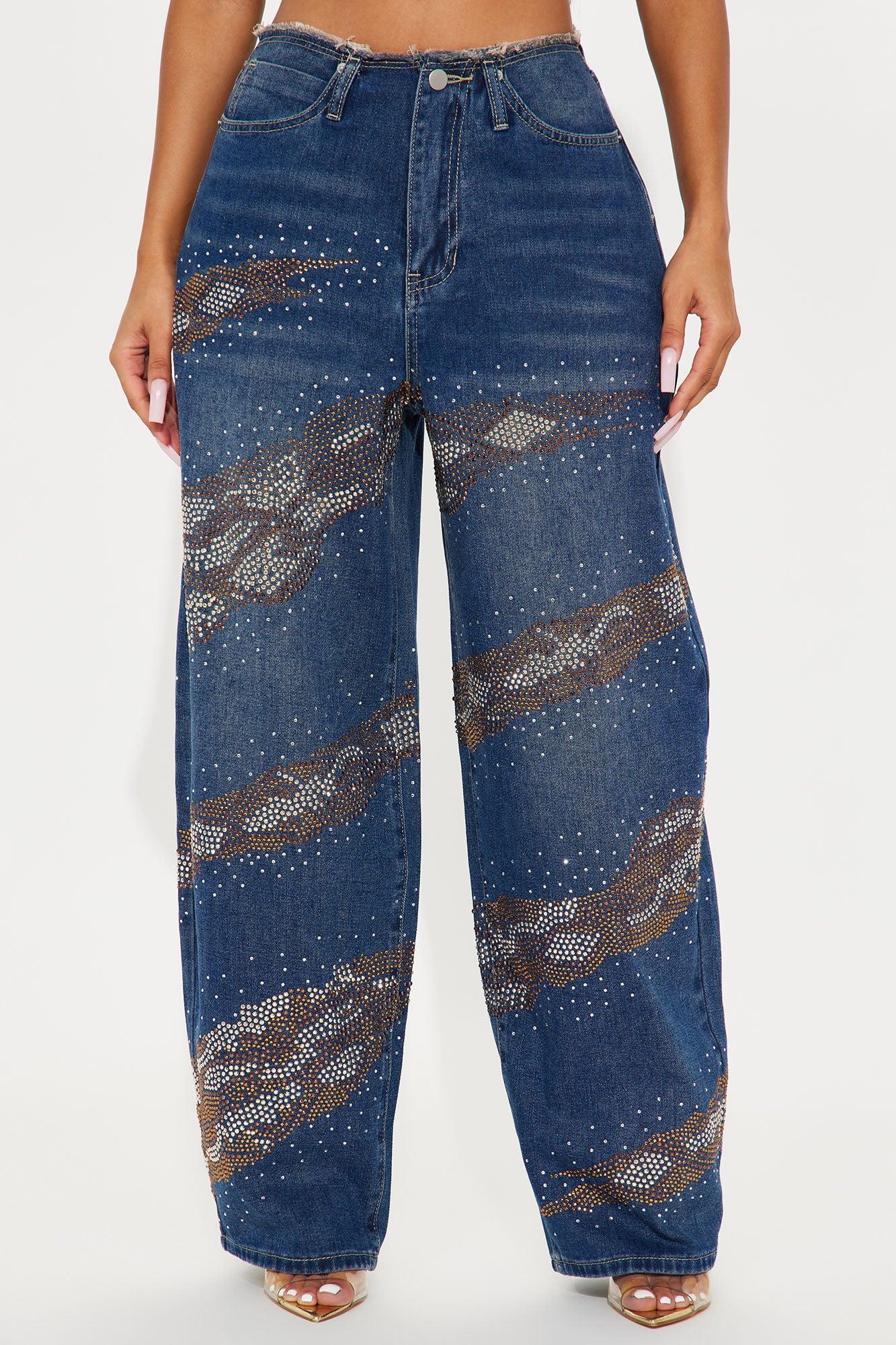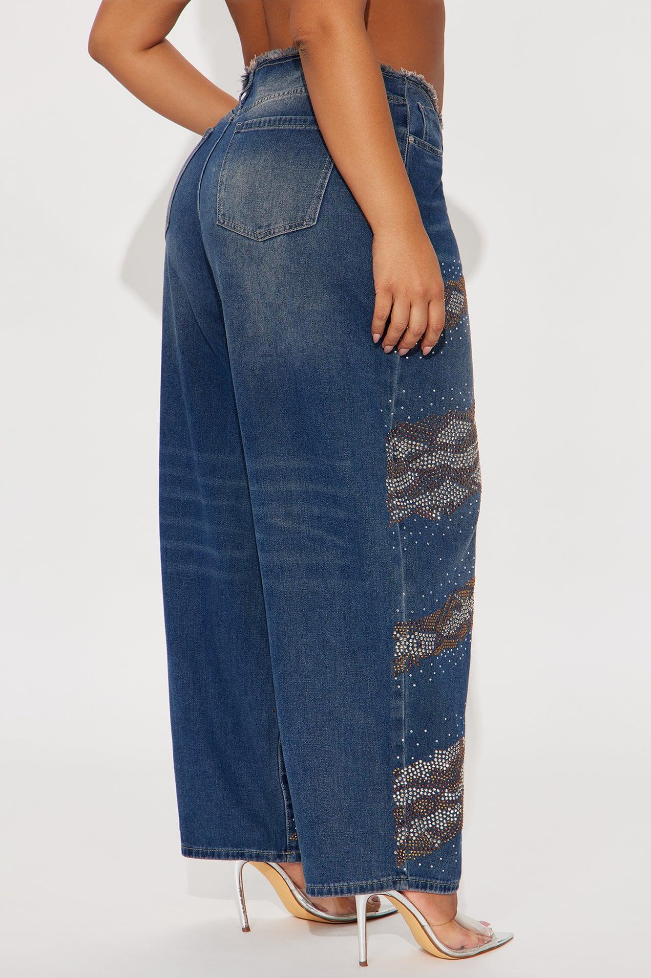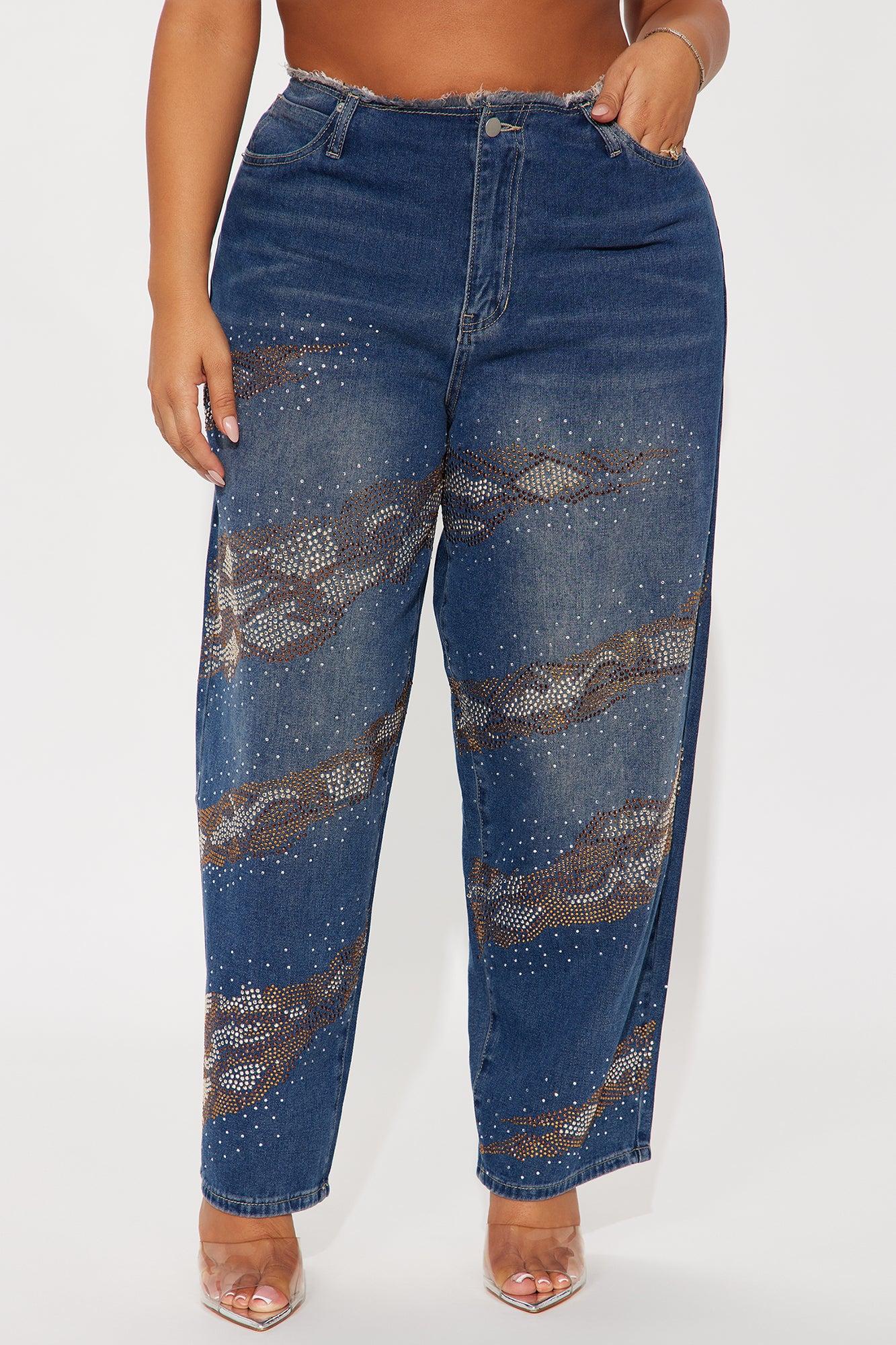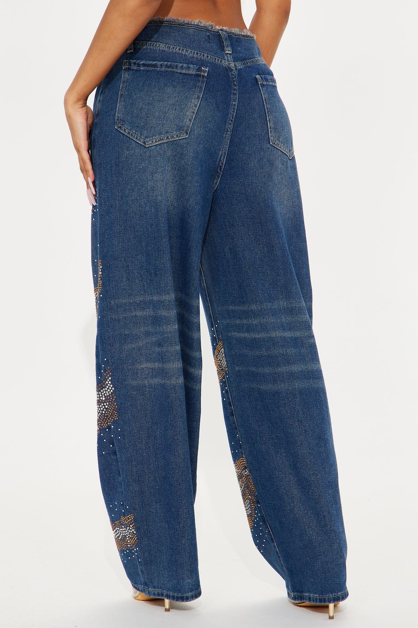 Available In Dark Wash. Barrel Leg Jean 5 Pocket Embellished Baggy Fit Frayed Cut Off Waistband 11.5" Mid Rise 29" Inseam Non Stretch Disclaimer: Due to Rhinestone Placement And Wash Process, Each Garment Is Unique. 93% Cotton 4% Polyester 3% Viscose Imported California Proposition 65WARNING: Cancer and Reproductive Harm - www.P65Warnings.ca.gov.