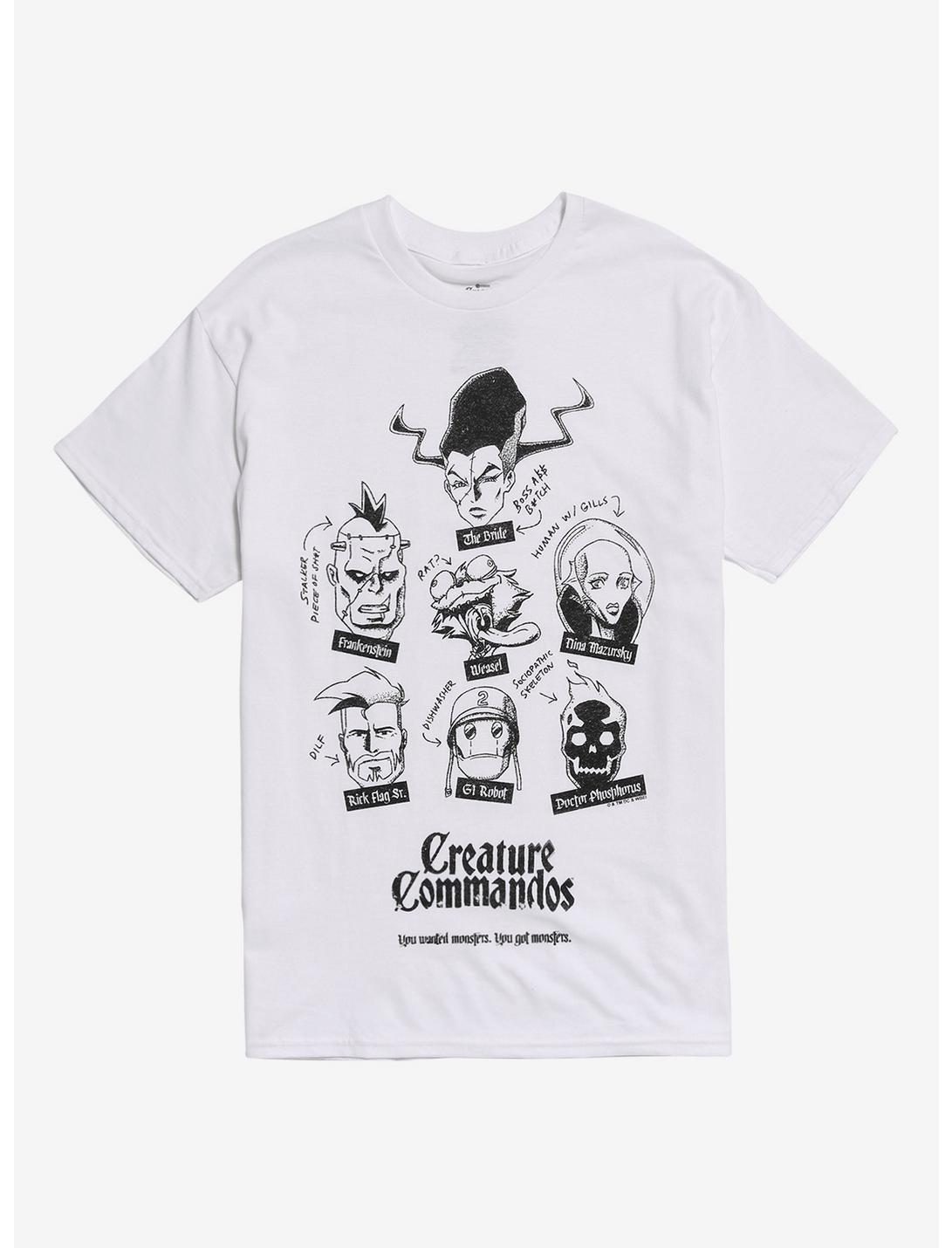 Roll call for the weirdest squad in the DC Universe! This white Creature Commandos tee features sketch-style artwork of the whole team, complete with handwritten notes that capture their chaotic vibes. With Frankenstein, The Bride, Weasel, and more, this shirt is the ultimate tribute to the monster-filled misfit crew. 100% cottonWash cold; dry lowImportedListed in men's/unisex sizes