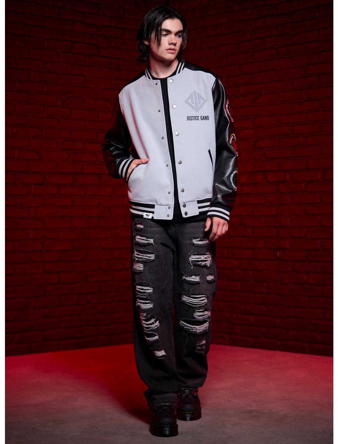Become the newest member of the Justice Gang in this Superman varsity jacket! Designed with a light grey body and faux leather sleeves. Patches for Hawkgirl, the Green Lantern and Mr. Terrific are highlighted down the left sleeve. Features "Justice Gang" embroidered at the chest with a rubber patch of their logo above. Complete with snap-buttons and front pockets.80% polyester; 20% rayonWash cold; dry lowImportedListed in men's/unisex sizesModel wears size Medium