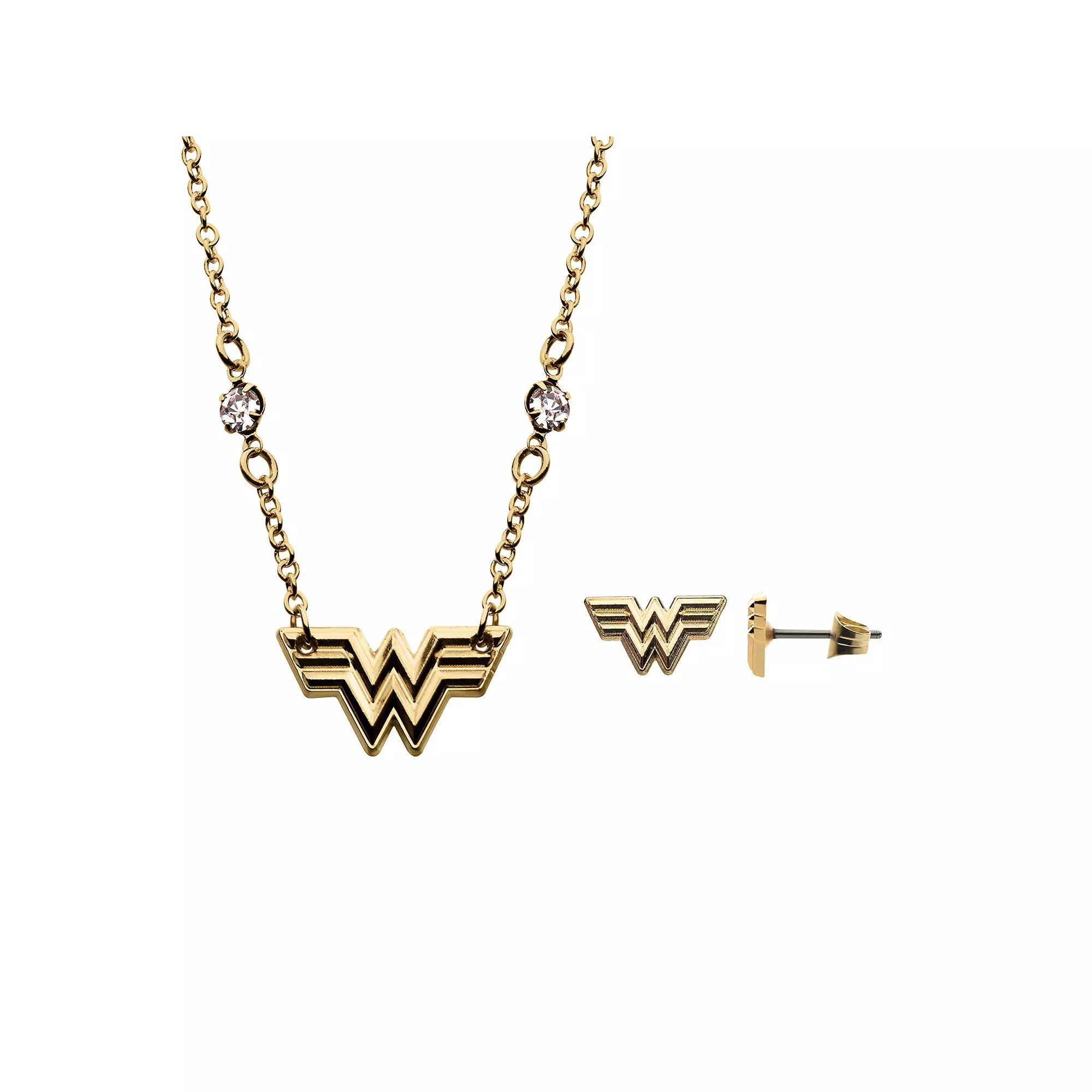 Show off your Wonder Woman fandom with this incredible gold tone stainless steel logo pendant and stud earring set. Show off your Wonder Woman fandom with this incredible gold tone stainless steel logo pendant and stud earring set. Pendant size: 2 cm Chain type: rolo Earrings: 1.3 cm Backings: post Metal: stainless steel Plating: gold tone Finish: polished Packaging: boxed Please note, due to the high value of this item, a signature may be required upon delivery. Size: One Size. Gender: female. Age Group: adult.