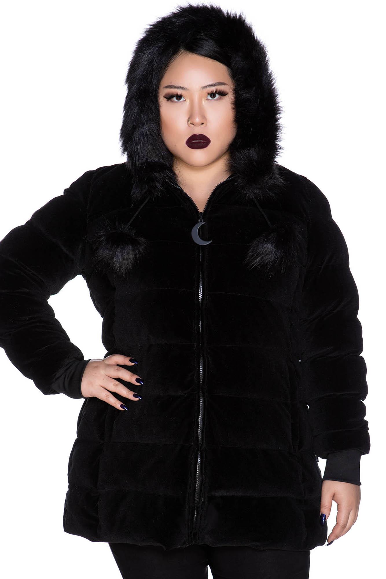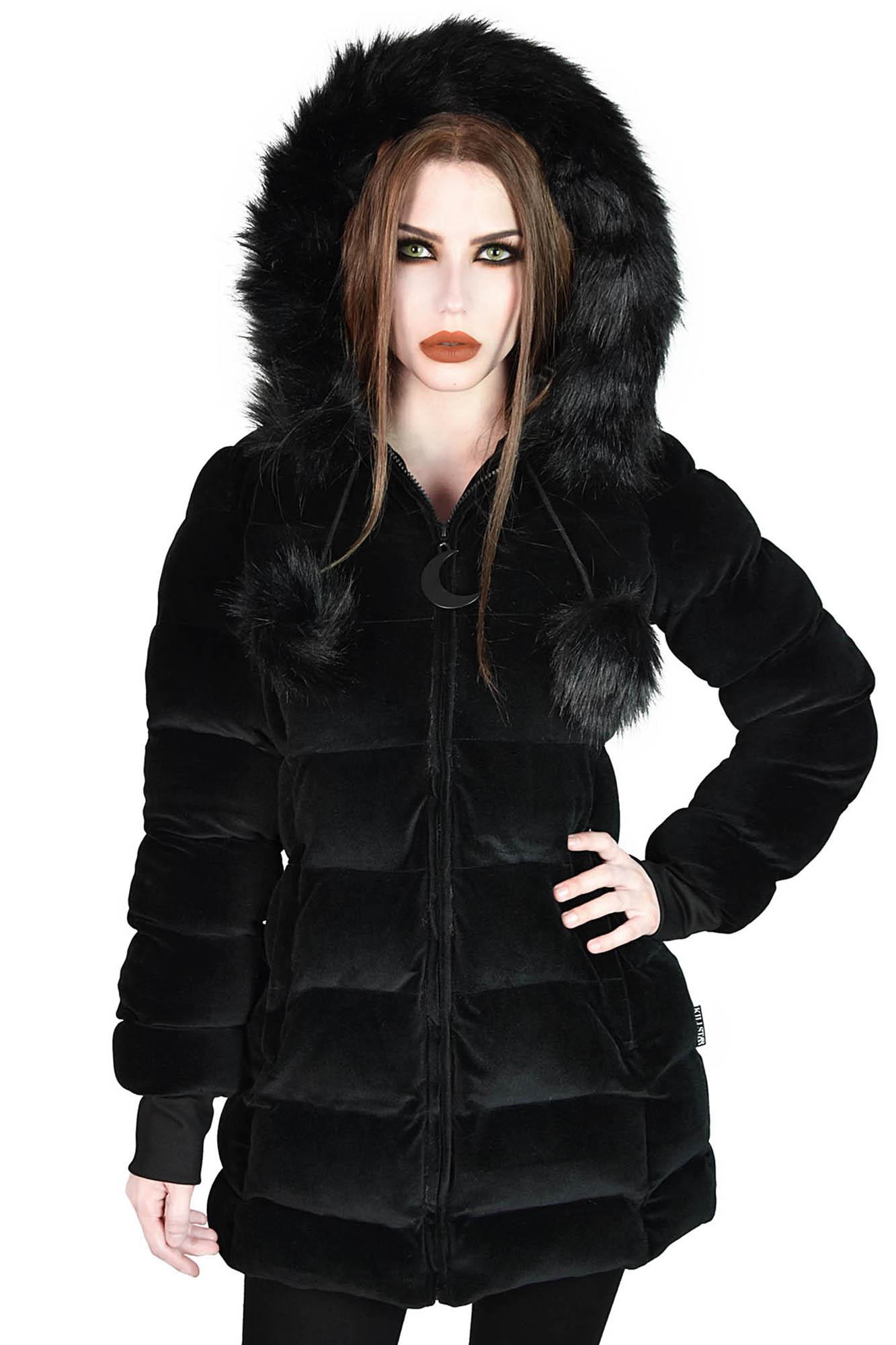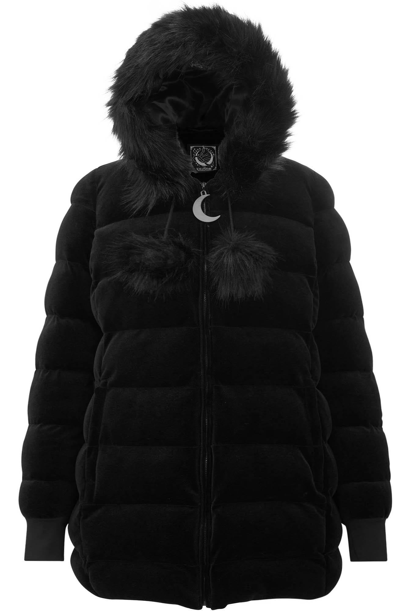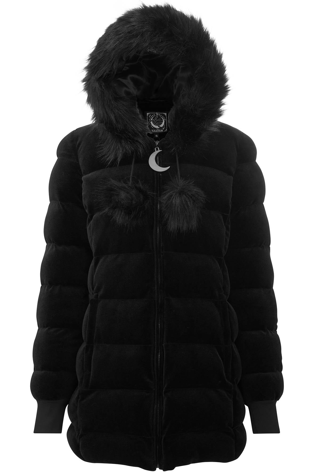 DEAD OF NIGHT. Only in darkness can we glimpse the fullest light our soul carries for us. - Luxe Soft-touch Velvet.- Padded + Fully Lined.- Fur Accents.- Oversized Hood. - Moon Hardware. - Longline.- Pockets.- Fitted. Be ready to battle the elements in the 'Dead of Night' velvet coat; made using a superior combination of luxe soft-touch velvet with faux-fur accents! Features an oversized hood and zipped front w/ moon hardware. Complete with pockets - to fit yer fav COVEN lipsticks or witchy trinkets. Longer in length to keep you cosy all-day and all-night! Match as yer dark heart desires - fits any mood/moon! We recommend; Dry Clean Only. With KILLSTAR Branding, 92% Polyester 8% Elastane.