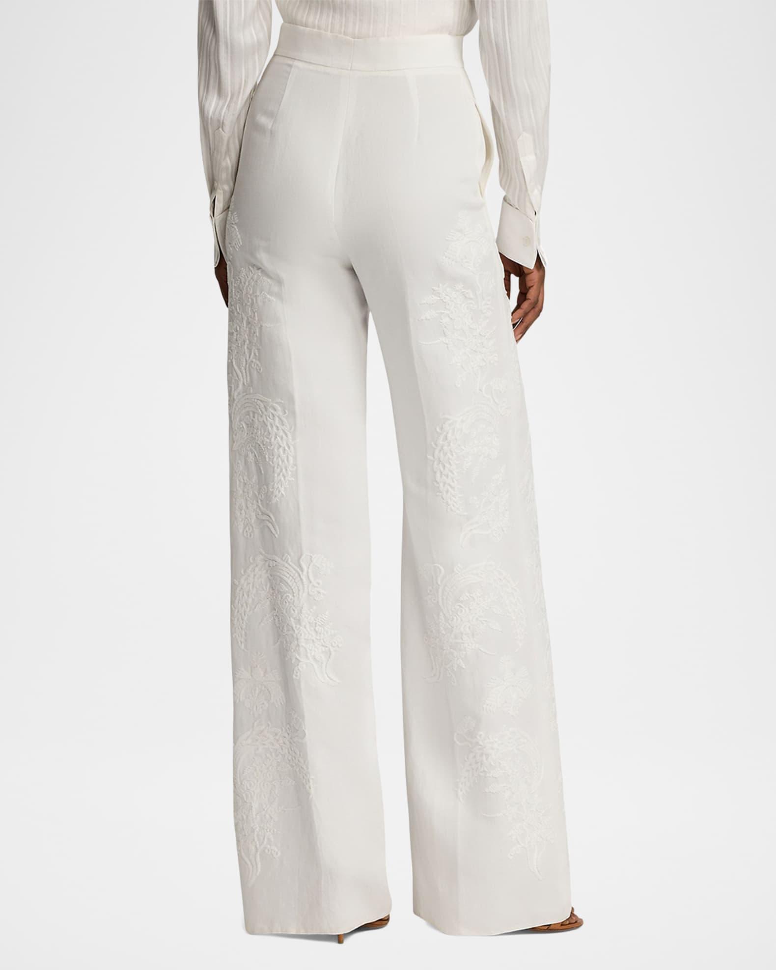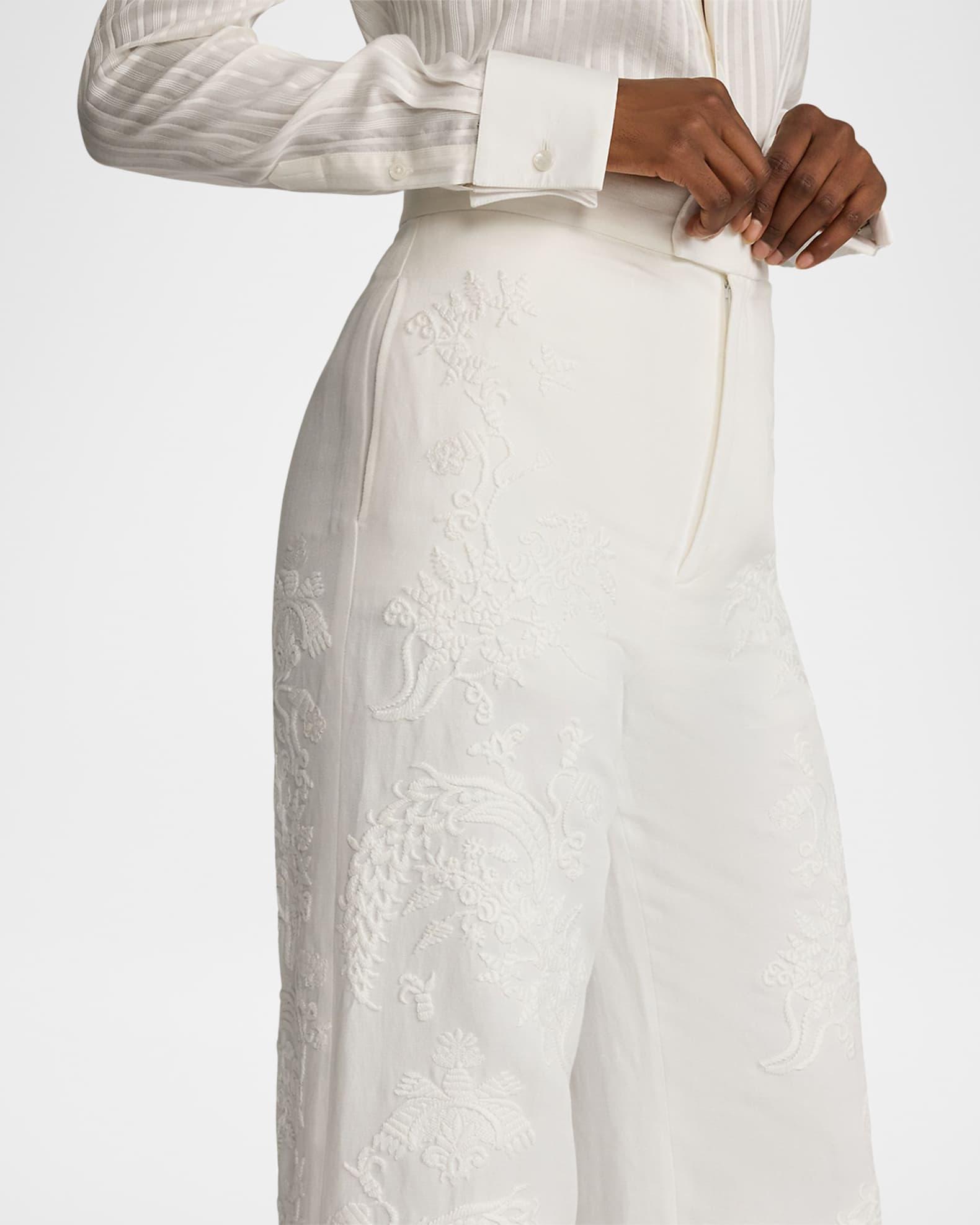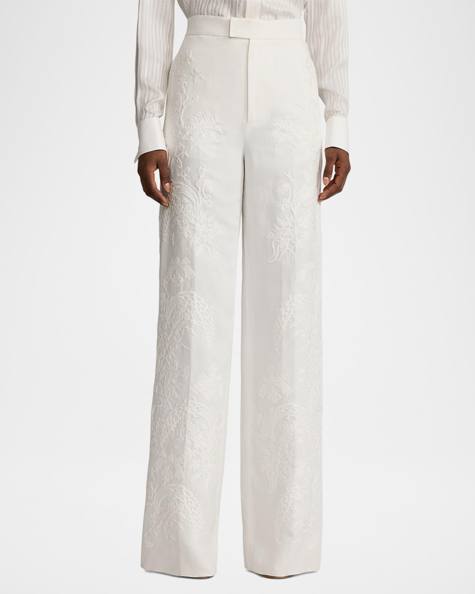 Traditionally tailored with waist darts, the dean pant is fitted through the waist and hip with a slightly wider leg. Capturing the relaxed sophistication of hamptons living, this version is crafted with a luxuriously soft, plant-based blend—selected for its breathability and moisture-wicking properties—and features tonal paisley embroidery down each leg. Ralph Lauren Collection "Dean" pants showcase tonal paisley embroidery High rise; fitted at the waist and hips with a slightly wider leg; intended to hit below the ankle Zip fly with an extended waist tab and a hook-and-bar closure; interior stay button Side on-seam pockets Lyocell/hemp/silk Made in Italy