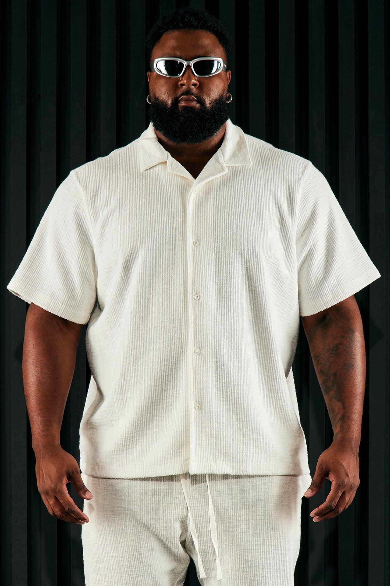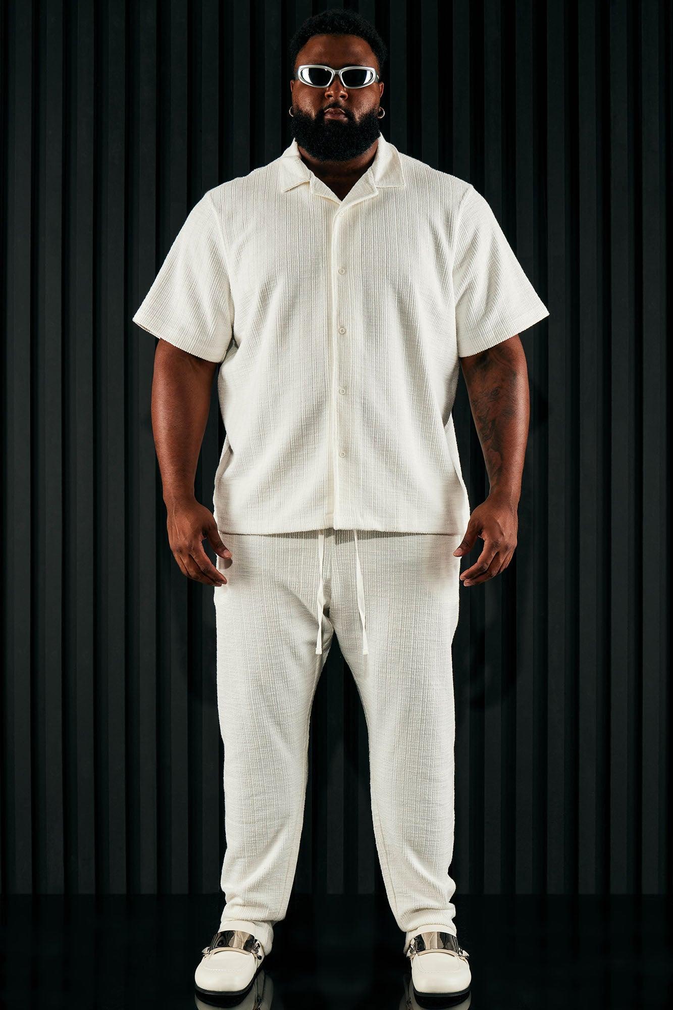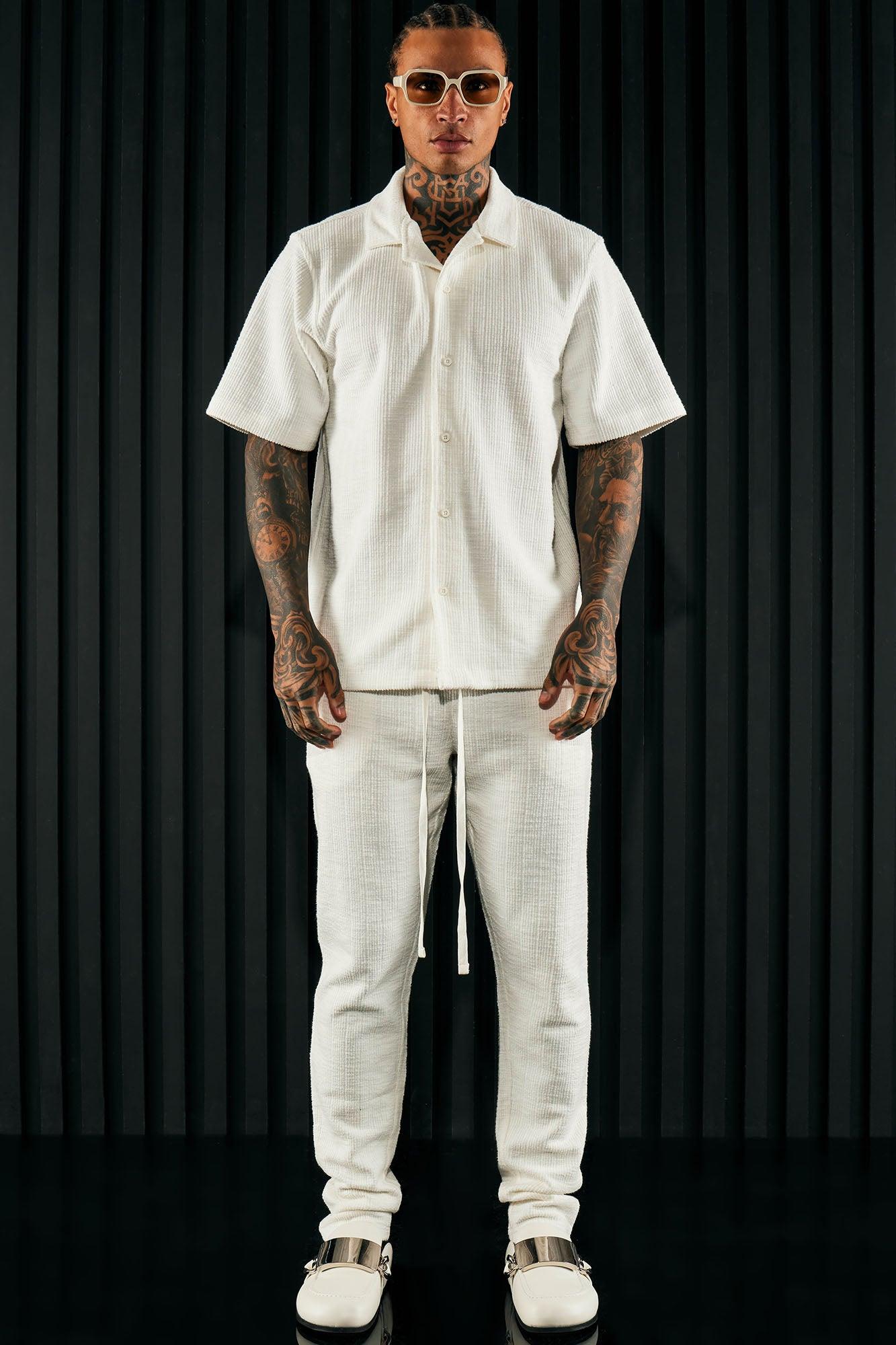 Available In Black, Cream And White. Fold Down Collar Front Button Closure Short Sleeve Pair With "Dean Textured Slim Pant" 62% Cotton 38% Polyester Imported